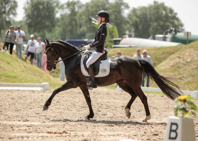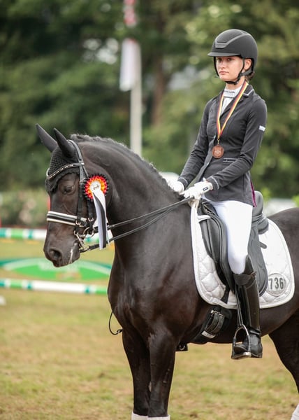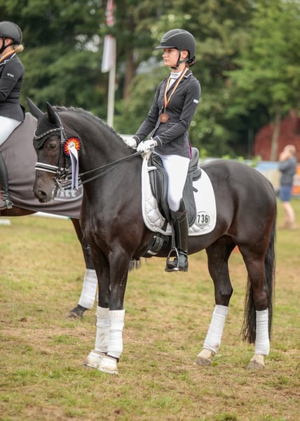 Due to the end of our pony time, we are reluctantly selling our 9-year-old, 1.48 m tall pony mare. She is sired by the top stallion Dark Dornik, providing her with the perfect foundation for FEI sport. At the age of 4, she participated in the Bundeschampionat with her previous owners. She moved in with us at the age of 5, and we have gradually trained her to become an FEI pony. Over the years, she has won many E dressage tests with our daughter, scoring up to 9.0, and A dressage tests up to 8.5. They also became district champions. The duo has achieved many placements at L level, including a victory with a score of 8.2 last year. Additionally, she has had the opportunity to experience FEI sport in the past two years, where she has already secured several placements in the top 4. She is always clear-headed at competitions, reliable in her movements, and is always an eye-catcher! The 2025 competition season started successfully with ribbons (L* and Dr L), including a 3rd place in an L** class with a double bridle. In mid-June, they became 3rd district champions at L level. She is an exceptionally lovable and charming pony with above-average basic gaits. She also has good coverage. We are looking for a talented child who is already confident in A dressage and now wants to take the step towards L. A current veterinary check from April 2025 is available without any findings (including back). The sale is really difficult for us, so we are only letting her go to proven good and supportive hands. The price includes her saddle and bridle. So, if you are looking for a reliable sport partner for your child, with whom they can start immediately, this pony is just right for you. For phone inquiries, please contact 0175 8279830 after 1 PM. I will only send videos after a phone call.