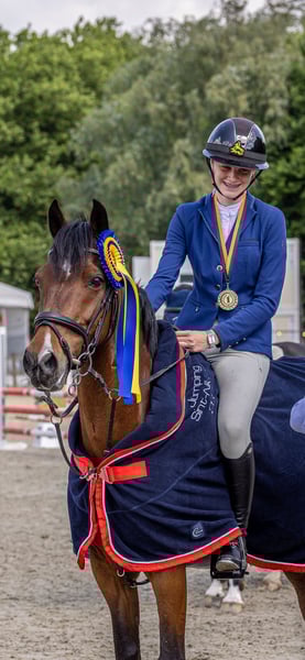 Aufgrund des Wechsels zu den Pferden steht dieser kompakte D-Pony zum Verkauf: Road Runner – 147 cm – Wallach (Machno Carwyn x Santano Van Germania). Er verfügt über umfangreiche Wettkampferfahrung im Springen bis 110 cm und in der Dressur auf DL2-Niveau. Er hat drei schöne Gänge, ist nicht heiß im Temperament und besitzt ein äußerst ruhiges Wesen. Sehr brav im Umgang, beim Schmied, beim Putzen, beim Aufsatteln, auf dem Anhänger usw. Er ist es gewohnt, durch Wasser zu laufen, Strandritte zu machen, ohne Sattel zu reiten und ist für Ausritte im Gelände allein oder in der Gruppe geeignet.