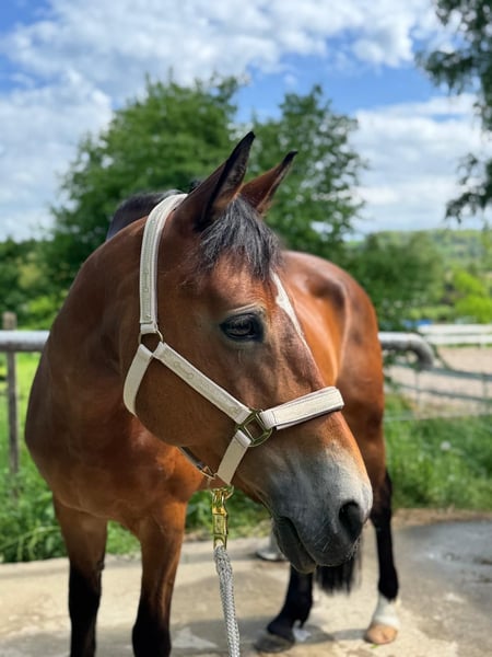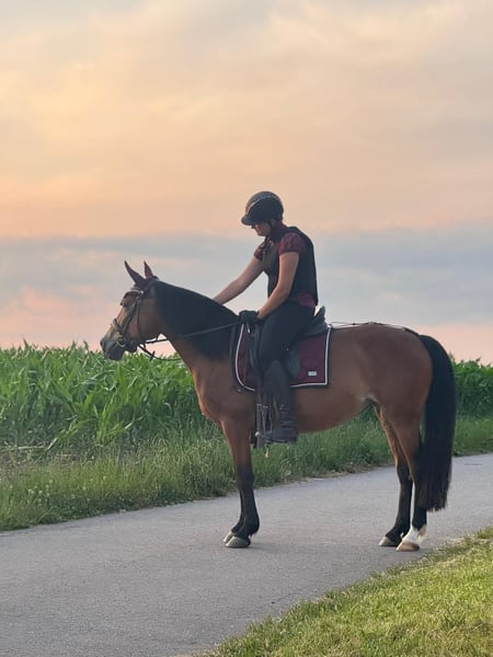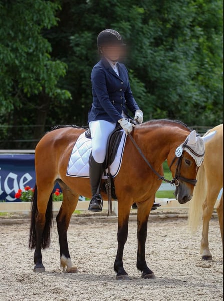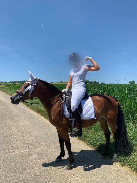 Wir suchen ein neues Zuhause für unsere Ponystute. Rasse: Polnisches Reitpony Sie hat 1,48 m Stockmaß und kann durch Ihren stabilen und kompakten Körperbau auch größere Reiter abdecken. Sie ist außerdem 14 Jahre alt ohne jegliche Unarten! Unsere Stute ist super brav im Umgang! Meine Tochter hat sie mit 11 Jahren bekommen, und die beiden haben so alles miteinander gelernt, ist jedoch jetzt leider zu groß geworden mit 1,80 weswegen wir das allerbeste neue zu Hause für sie suchen... Sie kennt den Offenstall und die Boxenhaltung mit Paddock/Weidegang ist für sie eine bessere Haltung, im Offenstall hat es auch geklappt nur sie kommt in der Box besser zur ruhe. Sie ist sehr lernwillig, und möchte dem Reiter immer gefallen. Super klug, mit kleinem Ponykopf. Sie brauch Beschäftigung, geistig und körperlich. Und brauch Abwechslung im Training, Damit ist sie zufrieden. Jedoch entwickelt sie keine Unarten bei weniger Programm. Schön wäre es wenn sie eine feste Bezugsperson haben würde oder in Kombi mit einer RB. So war es bei uns immer und hat super geklappt! Sie liebt Stangenarbeit und alles was mit Hüpfern zu tun hat. Ob es Springen ist oder Trabstangen. Die Dressur meistert sie ebenfalls mit Bravour, ist sehr bemüht und gibt alles. Sie ist schon mehrere Turniere gegangen. Von Reiter WBs in der Dressur und im Springen bis 60 cm, in der Dressur auch eine A-Dressur gegangen. Auf Turnier auch mittlerweile super händelbar! Ganz gut verträglich mit anderen Pferden, andere Stuten mag sie eher weniger. Jedoch nicht dramatisch. Geimpft, entwurmt, gesund. Steht in 79576 Weil am Rhein Bitte nur ernst gemeinte Anfragen. Deuber Dressur Sattel vorhanden. Equipment Zaum, Satteldecken alles vorhanden Lammfellgurt etc