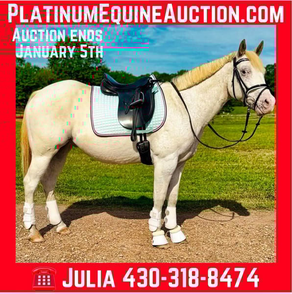 ONLINE AUCTION Place your bids at www.PlatinumEquineAuction.com Starting Bid $3500 Auction ends January 5th, 2024 Need a new saddle? Check out White Rock Saddles on our website or Facebook! Standing at 14 hands, and a 2014 model, Bullet is a versatile and striking gelding with a white coat, Appaloosa splashes, and a unique half-blue eye. With his thick build and solid bone structure, he’s as sturdy as he is beautiful. Bullet is at the prime age of seven and ready to go on to his forever home. He is a fancy broke, willing, and talented gelding. Bullet is a true all-rounder, excelling in English, Western, trail riding, bareback, and even bridle less riding. He’s beginner-friendly, making him the perfect mount for riders of all levels. Whether you’re looking for a safe, gentle partner for a child or an adaptable pony for a seasoned rider, Bullet rises to the occasion. He has Been exposed to Balls, tarps and flags and never gets spooked, no matter what we exposed him to. He’s traffic-safe, parade-proven, showcasing his calm demeanor and reliability in any situation. He has seen countless miles out on the roads, through town, pastures or trails and loads of arena work. He does it all well and has been enjoyed by everyone who has ridden him. Very easy and uncomplicated ride. He has a very trainable mind and loves to work. He stays the same no matter if you ride him daily or once a month. This “in-your-pocket” gelding has a sweet, friendly personality and is always the first to greet you at the gate. Bullet loves the attention and loves being around you. He is kind and respectful of your space on the ground, but will follow you like a puppy simply because he wants to be near you. He is the best of both worlds, a best friend and super talented ride. He thrives on attention and connection, making him an excellent family companion. He is very smooth, level headed, great on his feet and can handle any terrain. He gets along well with other horses and is clean and quiet in the stall. Bullet is sound, up-to-date on dental care, vaccinations, and worming, with his hooves freshly trimmed a couple of weeks ago. Ties, cross ties, bathes, and is great for the vet and farrier. Wonderful in a stall and acts like a seasoned pro in new environments. He is an absolute joy to have. He requires no maintenance and is ready to move into his next home without any hassle. Don’t miss out on this one-of-a-kind gelding—Bullet is sure to steal your heart! Contact Julia Gonzales 430-318-8474 Located in Texarkana, TX. ONLINE AUCTION Place your bids at www.PlatinumEquineAuction.com Starting Bid $3500 Auction ends January 5th, 2024 Need a new saddle? Check out White Rock Saddles on our website or Facebook!