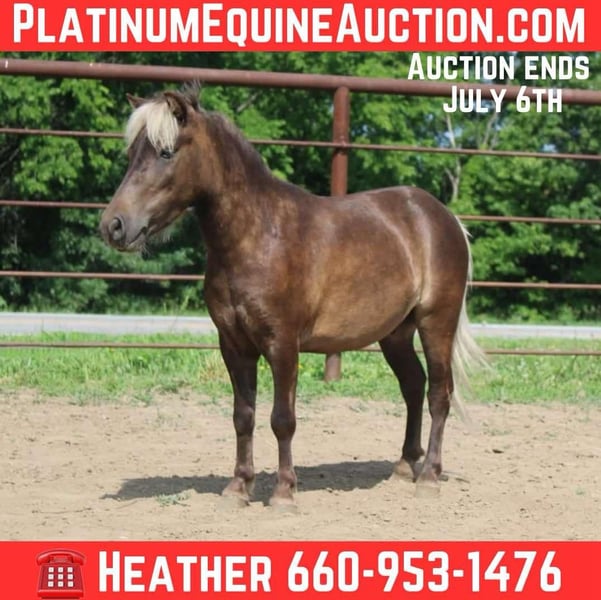NLINE AUCTION Place your bids at www.PlatinumEquineAuction.com Starting Bid $3500 Auction ends July 6 2025 Need a new saddle? Check out White Rock Saddles on our website or Facebook! Meet Buttons – The Sweetheart Pony with an Old Soul! Princeton, Missouri | Call or text Heather Stark at 660-953-1476 Looking for a pony your kids will love and you can trust? Say hello to Buttons, a 4-year-old chocolate palomino gelding standing 40 inches (10H) tall, with the gentle heart of a grandpa and the look of a storybook pony. Buttons may be young, but he’s been handled like a pro—hauled, loved on, wallered by kids, and never flinches. He’s beginner-safe, super sweet, and stays quiet no matter what you throw at him. ✅ Rides & drives the VERY best ✅ 100% sound and safe ✅ Picks up his feet ✅ Loads, ties, bathes like a champ ✅ Handles new things in stride—cattle, equipment, you name it ✅ Goes out alone or with a group ✅ Perfect family addition! Whether you want a first pony for the littles, a fun cart driver, or just a calm, loving addition to the family, Buttons checks every box. He’s the kind that’s hard to find and even harder to let go of! Buttons is the pony dreams are made of—and he’s ready for his forever home! ONLINE AUCTION Place your bids at www.PlatinumEquineAuction.com Starting Bid $3500 Auction ends July 6 2025 Need a new saddle? Check out White Rock Saddles on our website or Facebook!