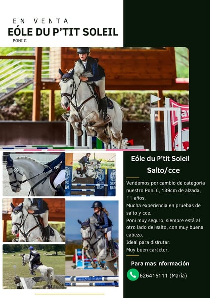 Vendesi pony di categoria C di 11 anni, altezza al garrese di 140 cm (certificato di misurazione ufficiale). Pony nobile, ideale per iniziare a competere, acquisire sicurezza e divertirsi, con un carattere molto equilibrato (sempre dall’altro lato del salto), non si distrae con nulla. Ha esperienza in concorsi completo e in prove di salto ostacoli. Abituato a lavorare sia in paddock che in campo. Si trova a Madrid.