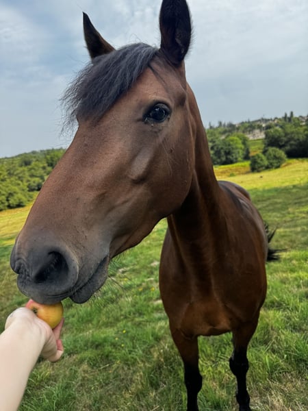 M'La Vie Du Tison, de son surnom Mulan, est une jument PFS bai née le 15 avril 2022 (4 ans) d'une taille actuelle de 1m40 au garot (encore en croissance). Très bonne génétique. Douce, calme, apprend très vite et proche de l'être humain depuis sa naissance. Vit actuellement au pré et a vécu en box pendant quelques mois sans aucun problème. Acheté «sauvage», sans aucun travail et réelles manipulations. Santé : à jour pour le dentiste, l'ostéo, les vaccins et le vermifuge. Parfaite pour le loisir, le sport ou l'élevage. A de très bonnes allures naturelles. Toute la partie débourrage a été effectué. Il n'y a plus qu'à la travailler à votre main. Acceptes la selle mixte et de dressage, tout accessoire de travail (caveçon, filet etc), le cavalier aux 3 allures, les longes, l'attache, les couvertures, le masque à mouche etc. A déjà fait plusieurs séances montées, longées, barres au sol dans le respect de sa croissance. Respecte le cavalier en main et monté. Ne fuit pas à l'approche dans le pré. N'a pas de mauvais comportement. Se laisses manipuler sans problème pour le pansage sur toutes les zones. Possibilité supplémentaire de vous donner sa couverture imperméable Equithème 100G et sa séchante ainsi que certains accessoires. Vous pouvez également effectuer un rachat pour le filet, caveçon etc. Possibilité de venir la voir aux écuries principalement les matins, certaines fins d'après-midi ou le dimanche. Factures dentaires, vétérinaires (etc) à la demande lors de votre visite uniquement.