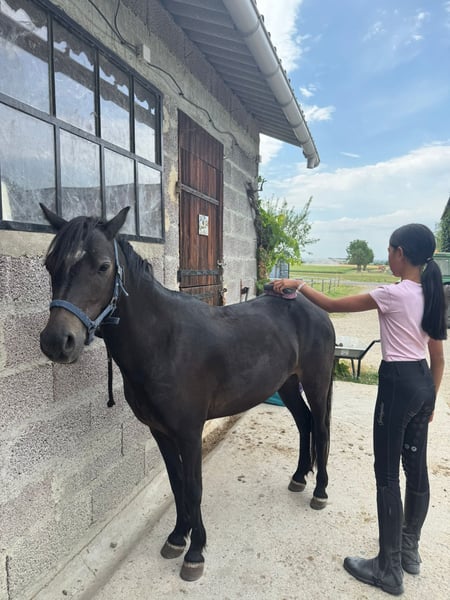 Kleine PFS van 4 jaar, met een schofthoogte van 1,18 m, geschikt voor club- of recreatief gebruik. Pony dicht bij kinderen, heeft deze zomer deelgenomen aan ethologie- en Equifeel-workshops en was voorbeeldig. Ze heeft al een veulen gehad.