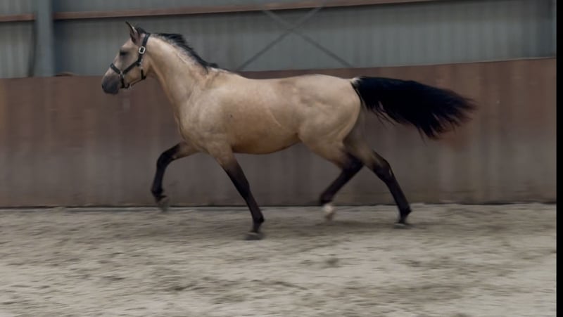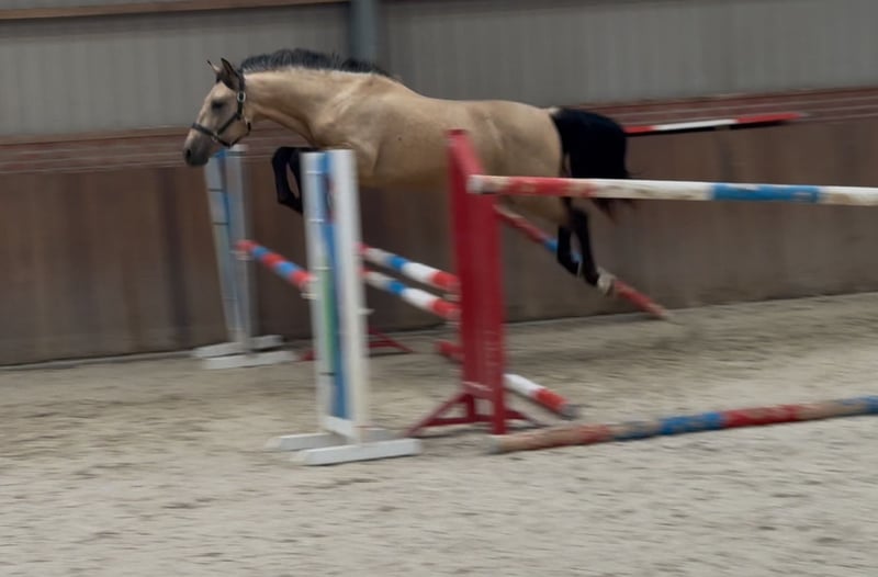Tribunolas is a very beautiful specimen. Not only because of his lovely color, but also due to his appealing type and appearance. He currently stands at a height of 1.53m. He possesses three good basic gaits. He moves with great suppleness and good leg technique. He can also naturally change leads easily. His first free jumps are promising. He shows a lot of athletic ability. He jumps with quick reflexes and good technique, consistently finishing well behind the jump. He was castrated about 6 weeks ago. Tribunolas has not yet been backed. However, he is honest in handling and has a curious and level-headed character. Please call or message if interested. A video is available. Phone: +31(0)643197337