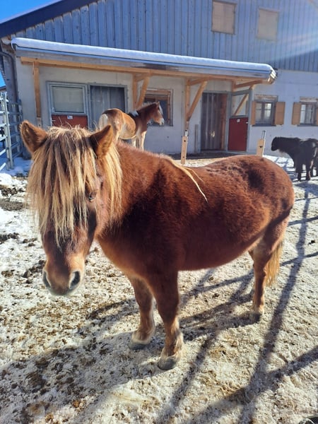 Verkaufe meine ca. 104 cm große, 12 jährige Shetty Stute. Sie ist nicht ausgebildet (wir gehen spazieren mit ihr), liebt andere Pferde und ist sehr vertäglich, steht bei mir in einer kleinen gemischten Herde. Im April wurden die Zähne gemacht, sie ist geimpft und gesund. Sie ist brav beim ausschneiden und liebt es geputzt zu werden. Sie ist sehr bewegungsfreudig daher ist ein Offestall ideal. Im Stall kennt sie kleine Kinder und da ist sie auch lieb, ansonsten braucht sie aber eine starke Hand und jemand mit Pferdeerfahrung, der sich durchsetzen kann. Für mehr Bilder oder Info's gerne melden!