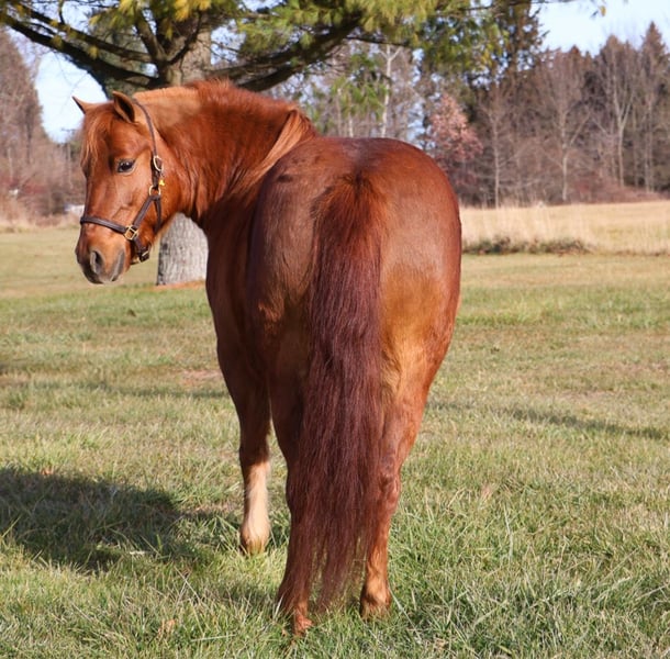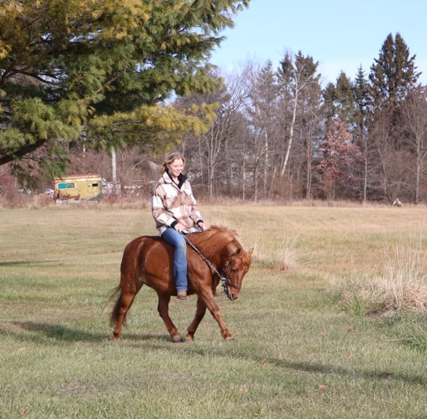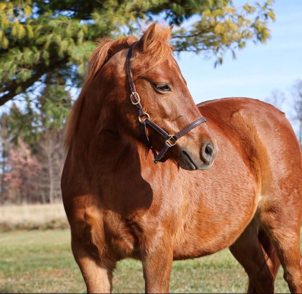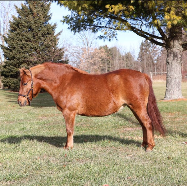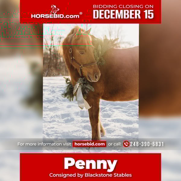 🎄𝐓𝐇𝐄 𝑯𝒐𝒍𝒊𝒅𝒂𝒚 𝐂𝐋𝐀𝐒𝐒𝐈𝐂🎄 Happening now thru MONDAY | DECEMBER 15th - Available EXCLUSIVELY on HorseBid's website! For more details and to register visit: www.Horsebid.com CONSIGNOR CONTACT: Blackstone Stables 248-390-6831 LOCATION: Howell MI BREED: Shetland REGISTERED: No COLOR: Chestnut HEIGHT: 12 AGE: 12 GENDER: Mare Are the words “Can I have a pony pleassseeee???” common in your house? Well, here she is kid tested and parent approved! Meet Penny! She’s a 12-year-old, 12hh chestnut pony mare, and you’ll be hard-pressed to find a pony as beautiful as her. She has a gorgeous deep red coat, and she’s as sweet as they come on the ground. Penny loves kids and is very respectful to work around. She gives kisses on command, and there’s not much this gal won’t do for a cookie or any sweet you have in your pocket. Penny has a quiet walk, a tiny trot, and just a kick gets her into a canter. She’s soft in your hand and listens well to voice commands. Her transitions are simple kiss to trot, kick to canter, and say “whoa” and she stops easily! The little kiddos can flop all over on a long rein and she will not go too fast. Did I mention she’s smooth? She has perfect gaits for a child who’s learning, as she’s as comfortable as a couch. Penny has extensive miles out on the trails. She’s been ridden all over Michigan and Ohio and has even been camping. She’s no stranger to woods, water, traffic, or wildlife. She’s been over bridges, through tunnels, and down the road! This is a pony who’s had years of kid miles, and her family has thrown every child antic at her she takes it all in stride. In the mood to do pony yoga? Groom for hours? Costume classes? She’s done it all with her littles and is always happy to soak up the attention. She plays well outside with others, and you can catch her anywhere. Penny requires nothing special. She’s the perfect size for any child, but sturdy enough that an adult can easily hop on. This pony will only sell to the best of homes where she will be loved and used. She’s beautifully colored and also well broke to drive! She stands to harness and hook up, and she drives like a Tesla. Just hold the lines or even better, climb in the cart and she’ll take you down the road, into town, through a parade, or even sledding! She is kid tested, mom-and-dad approved! Watch the videos she speaks for herself!
