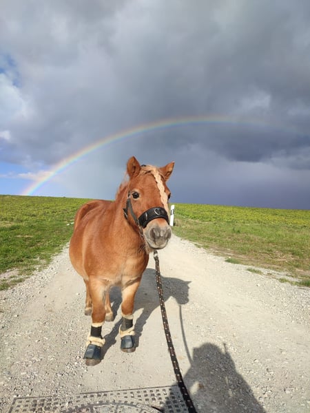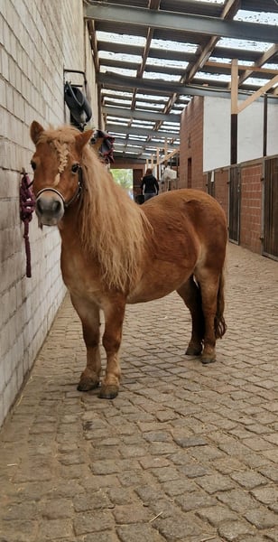 Guten Tag, Schwerenherzens biete ich hier die 14 Jährige Shetlandponystute Fienchen aus Privaten Gründen an. Sie ist 90 cm klein. Fienchen ist eine aufgeweckte Ponystute die ganz in Fuchmanier gerne eher Ranghoch ist, jedoch ist sie sehr gut Sozialisiert. Sie stand schon in ganz verschiedenen Stuten und Wallach Konstellationen in jeder größe und hat es doch letztendlich immer nach kurzer Eingewöhnungszeit geschaff sich in die Herde zu Integrieren. Ebenfalls kennt sie alles, von Boxen bis Robusthaltung, sie hat sich auch schon eine Box mit einer 1.65m Stute geteilt über Jahre. Ponytypisch testet sie anfangs ihren Menschen, wird dabei jedoch nie unhandelbar (kein treten,beißen,...) Hat man sie jedoch auf seiner Seite geht sie ganz entspannt mit einem durchs feuer und ist wirklich für jeden Spaß zu haben ! Ob Bodenarbeit,Longieren, ausgiebige Spaziergänge,... geritten und gefahren ist sie NICHT ! Aber jedoch gerade das einfahren stelle ich mir bei ihr super unkompliziert vor und kleine, sehr leichte Kinder akzeptiert sie auf ihrem Rücken. Ebenfalls geht sie nicht durch Zäune wenn die Litzen tief genug sind, ich habe das jedenfalls bei mir nicht mitbekommen, höchstens im Sommer mal wenn alle anderen auf der Weide stehen und sie alleine nebenan auf dem Paddock ist. Auf der Koppel jedoch garnicht. Vom Boden aus ist sie allerdings von Kindern wirklich super zu händeln und lässt sich liebend gern betüddeln. (Sie hat schon bei Ferienspielen mitgemacht und auch schon mehrfach mit mir Senioren im Altenheim mit mir besucht, wo wir sogar Fahrstuhl gefahren sind, ebenfalls kennt sie auch Menschen mit verschiedensten Beeinträchtigungen und lässt sich von diesen Problemlos betüddeln !) Fienchen leidet allerdings unter Hufrehe und hatte erst diesen Sommer wieder einen heftigen Reheschub. Bei außreichender Bewegung, vernünftiger Hufbearbeitung und Artgerechter Fütterrung (bei mir bekommt sie nur Mineralfutter und ab und zu ne Hand voll Mash) ist dies allerdings gut in den Griff zu bekommen. Ebenfalls hat sie Sommerekzem. Fienchen sucht also einen Herzensmensch der Lust hat sich mit einem total coolem, aufgewecktem und Intelligentem Pony zu beschäftigen. Fienchen kann ebenfalls mit kompletten Zubehör umziehen wenn gewünscht, also Putzzeug, Halftern,Trense,Longe,Doppellonge, Longiergurt, Hufschuhen,Ekzemerdecke,... Wir kommen aus Hannover