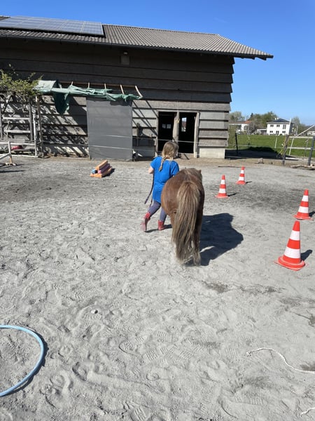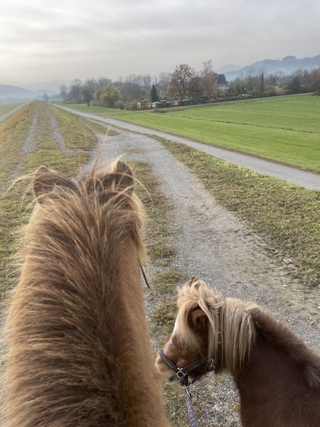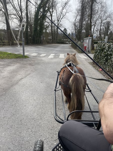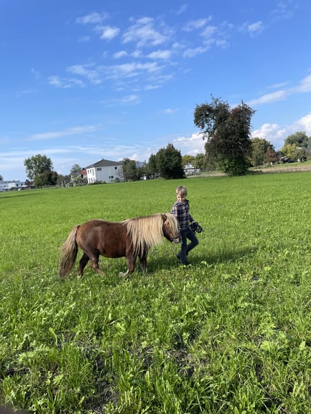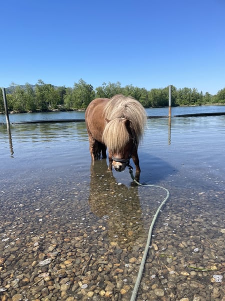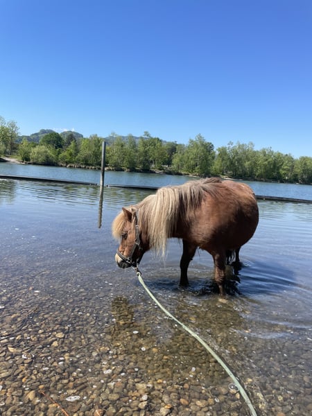 Bonnie ist ein super-tolles Pony mit vollen Papieren, mit dem man viel Spaß haben kann. Sie ist definitiv keine Schlaftablette, hat viel Go und liebt es, Neues zu lernen. Am liebsten geht sie mit Fahrradfahren oder ist als Handpony bei jedem Abenteuer dabei. Freispringen und Springen an der Hand ist ihre Leidenschaft, wir sagen immer, sie springt so hoch, dass man ihren Bauchnabel sehen kann. Berge (und Hügel) mag sie auch, ihr Lieblingsspiel ist es, bei uns dem Damm hoch und runter zu galoppieren. Sie wurde von einem Profi eingefahren, zweispännig macht sie das sehr gut. Einspännig hat sie noch Angst, vor allem, wenn der Zugstrang ihre Hinterbeine berührt. Das kann gut geübt werden, als wir es gemacht haben, hat es auch nach zwei, drei Einheiten funktioniert, nur die liebe Zeit..... Als Kinderpony ist sie nur bedingt geeignet. Kinder können sie führen und auch gebisslos frei reiten, sowohl auf dem Platz als auch im Gelände, allerdings NUR, wenn eine Vertrauensperson dabei ist. Viele Kinder auf einmal mag sie nicht so gerne. Trotzdem war sie bei mir auch bei Reitpädagogik-Einheiten dabei. Es gilt wieder: Mit einer Vertrauensperson dabei ist vieles möglich. Hänger fahren ist kein Problem, das machen wir recht häufig, um an anderen Orten spazieren zu gehen. "Schmiedefromm" würde ich jetzt gerne schreiben, ist aber nicht 100 Prozent so. (Und überhaupt läuft sie problemlos barhuf :). )Da kommt wieder das Vertrauen ins Spiel, sie braucht oft ein bis zwei Anläufe, bis sie einen fremden Mann an ihre Hinterbeine lässt, Frauen sind eigentlich kein Problem. Wir haben sie aus schlechter Haltung und wollen vermutlich gar nicht wissen, was sie erlebt hat. Es gilt auf jeden Fall Platz vor Preis. Sie wird nicht an Händler, Reitschulen, in Boxenhaltung oder als Beisteller verkauft. Warum gibt jemand so ein tolles Pony her? Wir finden hier leider keine Menschen, die Freude an der Arbeit mit Shettys haben und sie als Pflegepony haben möchte und das Kinderreiten musste ich aus persönlichen Gründen aufhören. Darum steht sie hier nur rum und frisst und das hat sie nicht verdient. Viel mehr Fotos und Videos gibt es gerne bei ernsthaftem Interesse auf Anfrage.