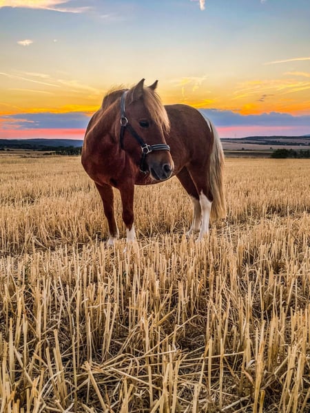 Shetlandpony Staatsprämienstute zu verkaufen – 6 Jahre, Fuchs-Schecke Zum Verkauf steht eine hübsche Shetlandpony-Stute mit einem Stockmaß von ca. 1 m. Es handelt sich um eine Staatsprämienstute, was ihre Qualität und Abstammung besonders hervorhebt. Die Stute ist ein auffälliger Fuchs-Schecke mit zweifarbigem Schweif, heller Hinterhand und einer Mähne im typischen Fuchsfarbton. Zudem hat sie vier weiße Beine – ein echter Hingucker mit besonderer Ausstrahlung. Sie wird dieses Jahr 6 Jahre alt und ist noch roh, also nicht eingeritten oder eingefahren. Sie zeigt sich frech und charakterstark, daher eher kein Anfängerpony. Aktuell wird sie bereits: * longiert * in der Bodenarbeit gearbeitet * und macht erste kleine Sprünge Sie bringt somit eine gute Grundlage für die weitere Ausbildung mit. Die Stute hat bisher noch kein Fohlen gehabt. Aufgrund ihres Alters und Temperaments eignet sie sich besonders für erfahrene Ponyhalter, die Freude daran haben, sich ein Pony selbst auszubilden. Weitere Infos gerne auf Anfrage.