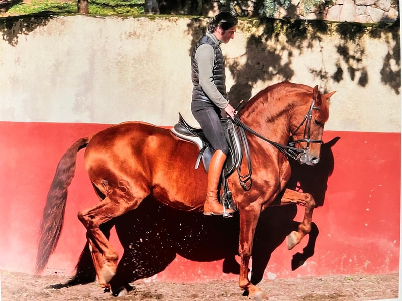 DOMA Y RENDIMIENTO Nivel: Alta Escuela Passage de nivel superior: Con gran elevación, ritmo y una cadencia espectacular que impone en pista. Piaffe magistral: Destaca por su potencia, perfecto equilibrio y gran expresión en cada movimiento. Salto entrenado y destacado: Formado en salto, afronta los obstáculos con seguridad y confianza, demostrando técnica, capacidad y agilidad. MORFOLOGÍA Y CARÁCTER Ejemplar fuerte y armónico, con una estructura ideal para el alto nivel. Su cuello poderoso, dorso firme y posteriores activos le aportan una presencia que cautiva a cualquier espectador. Posee un carácter noble y equilibrado, con una actitud impecable hacia el trabajo. Es un caballo fiable, completamente hecho y muy disfrutable para jinetes exigentes. GRAN SEMENTAL Aprobado como reproductor, ha sido utilizado como semental con resultados sobresalientes. Ha producido descendencia de gran calidad, excelente funcionalidad y buen carácter, confirmando su alto valor genético.