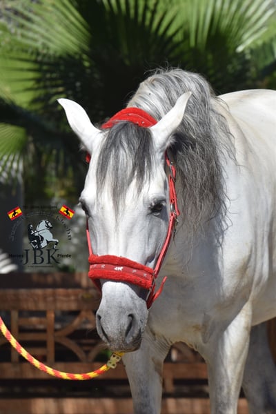 L'étalon PRE ORO KEOPS est né le 03.04.2014. C'est un amour de rêve qui est malheureusement cédé pour des raisons familiales. Il se comporte toujours correctement, n'est pas du tout docile et a un tempérament très amical. Il est issu d'un haras de première classe où il a bénéficié d'un élevage raisonnable. Il a également été correctement éduqué. Cependant, personne ne l'a monté ces trois dernières années par manque de temps. Il bénéficie donc maintenant de quelques heures de monte professionnelle en guise de rappel. Il a Bohorquez, La Cartuja, Hierro de bocado et YM dans sa lignée. C'est un superbe spécimen baroque de 1,66 m au garrot, bien mesuré.