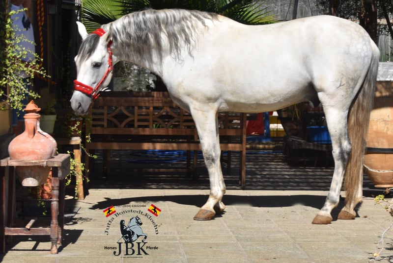 PRE stallion ORO KEOPS was born on 03.04.2014. He is a fantastically sweet darling who is unfortunately being sold for family reasons. He always behaves well, is not at all stubborn and has a very friendly disposition. He comes from a first-class stud farm where he enjoyed a sensible upbringing. He was also trained correctly. However, nobody has ridden him for the last 3 years due to lack of time. So he now gets a few hours of professional riding as a reminder. He has Bohorquez, La Cartuja, Hierro de bocado and YM in his bloodline. A great, baroque specimen with a 1.66 m frame, properly measured.