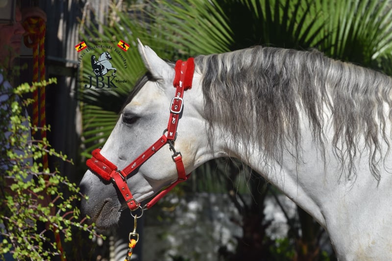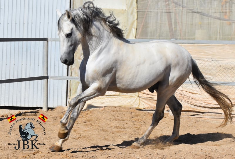 PRE Hengst ORO KEOPS wurde am 03.04.2014 geboren. Er ist ein traumhaft lieber Schatz, der leider aus familiären Gründen abgegeben wird. Er benimmt sich immer anständig, ist überhaupt nicht hengstig und von sehr freundlichem Gemüt. Er enstammt einem erstklassigen Gestüt, wo er eine vernünftige Aufzucht genossen hatte. Ebenso wurde er korrekt ausgebildet. Allerdings hat ihn in den letzten 3 Jahren aus Zeitmangel niemand mehr geritten. Er bekommt also jetzt ein paar Stunden Profiberitt zur Erinnerung. Er hat Bohorquez, La Cartuja, Hierro de bocado und YM in seiner Blutlinie. Ein tolles, barockes Exemplar mit 1,66 m Stockmass, ordentlich ausgemessen.