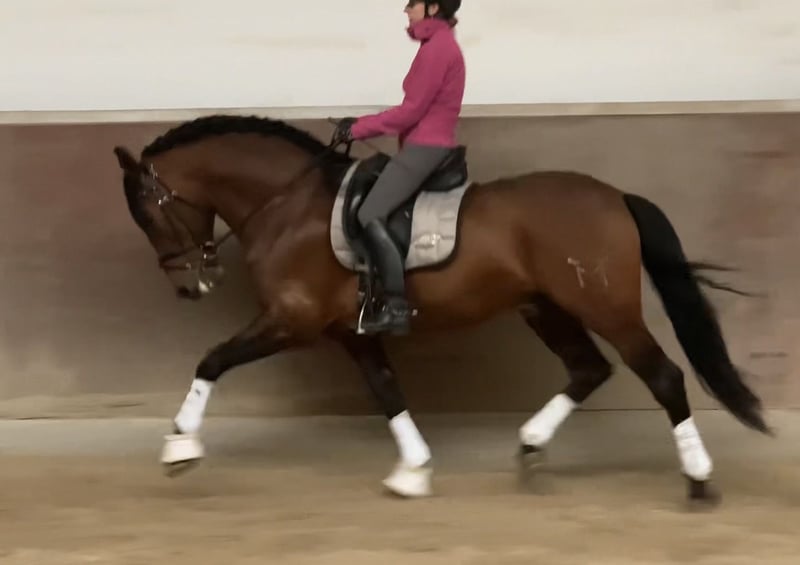 Uruguayo XXVII PRE / Stallion / Born 24.11.2014 / Dark Brown / 16.1 hh Sire: Academico VII, Dam: CRIOLLA III, Grandsire: MEJICANO XXV Beautiful, well-muscled dark brown PRE stallion with excellent basic gaits, abundant tail and mane. Training Solidly and calmly trained for dressage, leisure riding, trail riding, and working equitation. Trained up to M level with prospects for S, piaffe introduced. Experienced in competitions (FN events), presented and placed from A to M classes. First experiences in working equitation. Spanish walk initiated, confident on trails (alone and in groups). Character / Temperament A stallion with impeccable character, completely free of stallion manners. He is led to the paddock with another stallion and remains undisturbed among the mare herd. Very affectionate, well-behaved, and easy to handle, also with children. Willing to work, intelligent, quick to learn new things, and enjoys variety. A family horse from the very best circumstances. Health Guayo is properly vaccinated and dewormed (latest based on a fecal analysis). Currently barefoot behind, front with synthetic shoes (he was previously shod four times normally). A health check (AKU) can be performed upon request. Lodging Currently stabled in individual boxes with geldings, stallions, and mares in close proximity. Daily turnout on paddocks and pastures. Location Germany / 64380