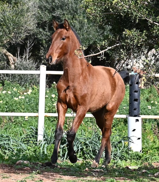 Dieses im Sommer 2024 geborene PRE-Hengstfohlen (Andalusier mit Rassenachweis der ANCCE), ist jetzt schon ein richtiger Hingucker! Noch darf er bei der Mama sein, jedoch wird er bald abgesetzt und in diesem Zuge sein Für-Immer-Zuhause gesucht. Er lebt 24h in Robusthaltung und hat Dank Menorcas harter Böden, eine richtig gute Hufqualität und ist gut gefesselt. Obwohl er so robust lebt, ist er unheimlich verschmust und kommt sofort freundlich den Kontakt suchen, wenn man auf die Koppel kommt. Seine Abstammung lässt die Freunde des spanischen Pferdes, sofort höher schlagen! Väterlicherseits ist er SENILLOSA gezogen, mit ESCALERA in den Ahnen. Mütterlicherseits ist er ein Enkel von DARTURO III, der aus der RETAMALES Zucht kommt, wobei seine Mama auch PLAZA DE ARMAS, sowie CAMPO BAJO Blut in sich hat. Diese hervorragende Zuchtauswahl, macht sich in ihm bemerkbar, denn er ist nicht nur jetzt schon schön mit einem rassetypischen Kopf und barocken Exterieur, sondern hat auch eine tolle Bewegung, die er totz der steinigen Böden gut präsentiert. Ein glückliches, freundliches Fohlen zu einem fairen Preis für diese Qualität. Sein Papa misst 170cm und auch er wird ein größerer Bub werden. Aktuell steht er auf Menorca! Videos und Abstammung gerne auf Anfrage. Gerne organisiere ich vor Ort eine AKU, , Transport oder auch ihre Reise, sollten Sie persönlich zum Anschauen kommen. Details dazu gerne auf meiner Seite oder im Gespräch. Saludos aus Spanien