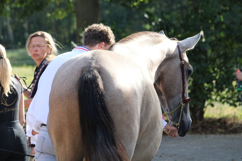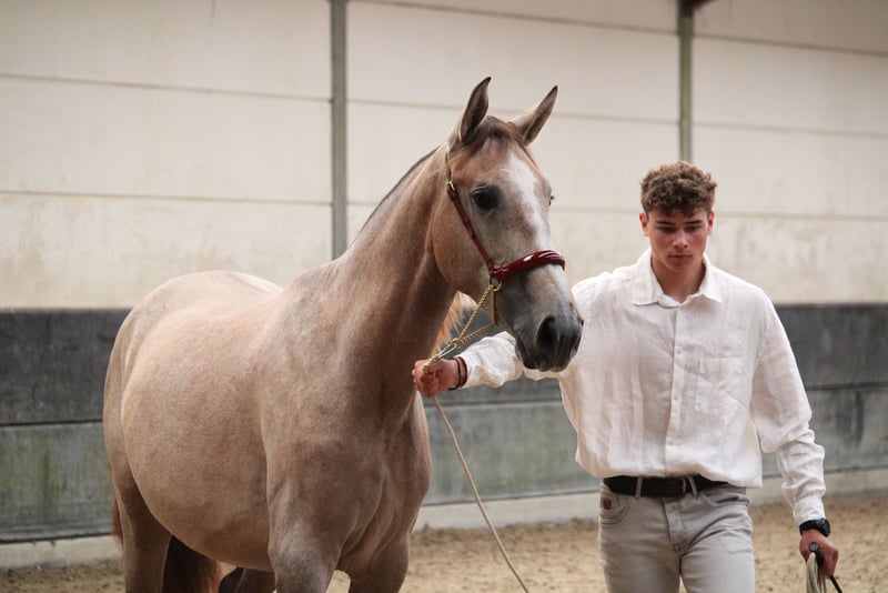 Bohemio es un joven semental PRE, nacido el 06/06/2023, hijo de Quien de Susaeta (fotos 8 y 9) y Ventolera Cum (fotos 10 y 11). Ambos padres han sido campeones múltiples en el Campeonato Centro Europeo, y Bohemio claramente tiene la intención de seguir sus pasos. Gracias a un fuerte y activo trasero, tiene un paso especialmente bueno, un trote muy amplio y un hermoso galope ascendente. Bohemio es dinámico y atlético, pero no es en absoluto un tipo nervioso. También en movimiento y en un entorno de competición, siempre mantiene su calma. Talla actual de Bohemio: 1m62 – talla final estimada 1m70 Bohemio puede ser castrado con nosotros si se desea. Nosotros somos veterinarios y podemos hacer un seguimiento completo después de la castración.