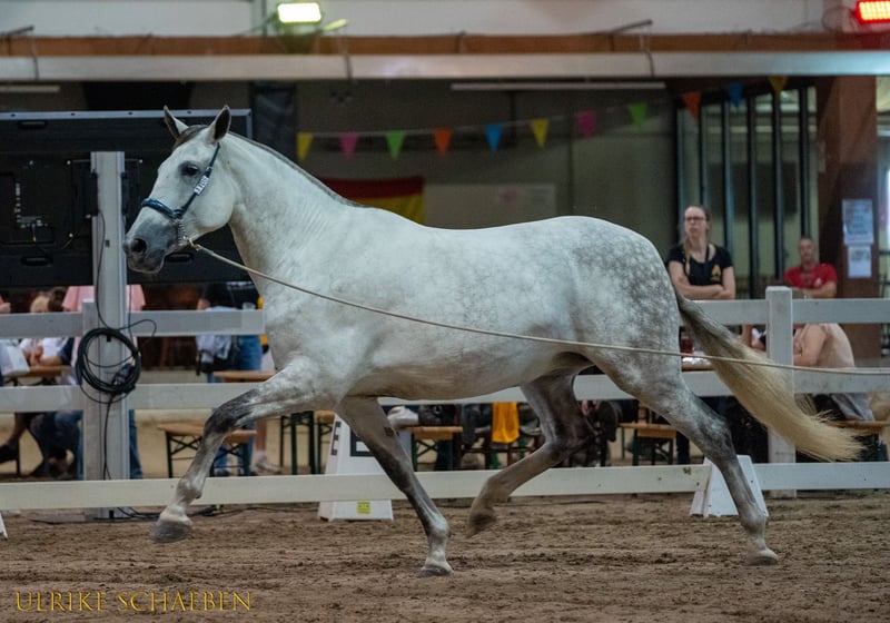 Bohemio ist ein junger PRE-Hengst, geboren am 06.06.2023 als Sohn von Quien de Susaeta (Fotos 8 & 9) und Ventolera Cum (Fotos 10 & 11). Beide Eltern wurden mehrfacher Champion bei der Campeonato Centro Europeo, und Bohemio hat eindeutig vor, in ihre Fußstapfen zu treten. Dank einer starken, aktiven Hinterhand hat er einen besonders guten Schritt, einen sehr raumgreifenden Trab und einen beeindruckenden aufwärts gerichteten Galopp. Bohemio ist dynamisch und sportlich, aber absolut kein nervöser Typ. Auch bei Verlagerungen und in Wettkampfumgebungen bleibt er stets sein cooles Ich. Aktuelle Stockmaß von Bohemio: 1,62 m – voraussichtliches Endstockmaß 1,70 m. Bohemio kann bei uns kastriert werden, wenn gewünscht. Wir sind selbst Tierärzte und können ihn auch nach der Kastration vollständig betreuen.