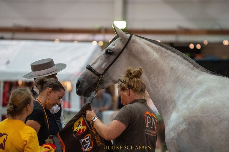 Bohemio is a young PRE stallion, born on 06/06/2023, son of Quien de Susaeta (photos 8 & 9) and Ventolera Cum (photos 10 & 11). Both of his parents were multiple champions at the Campeonato Centro Europeo, and Bohemio is clearly determined to follow in their footsteps. Thanks to a strong, active hindquarters, he has an exceptionally good walk, a very spacious trot, and an impressive upward canter. Bohemio is dynamic and athletic but absolutely not a nervous type. Even during transportation and in competition environments, he remains his cool self. Current height of Bohemio: 1m62 – expected final height 1m70 Bohemio can be gelded with us if desired. We are veterinarians ourselves and can provide complete follow-up care after the castration.
