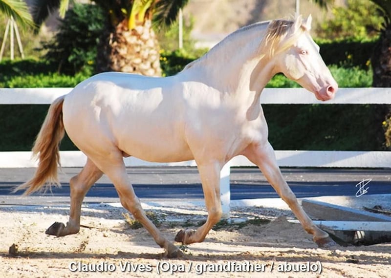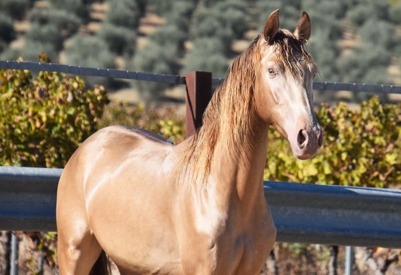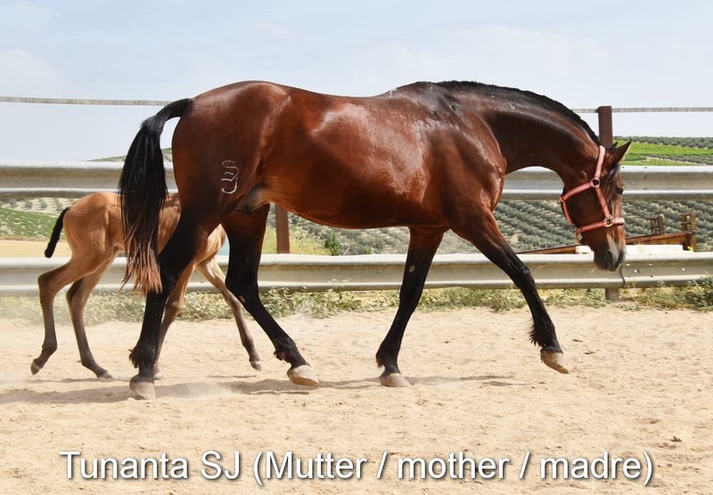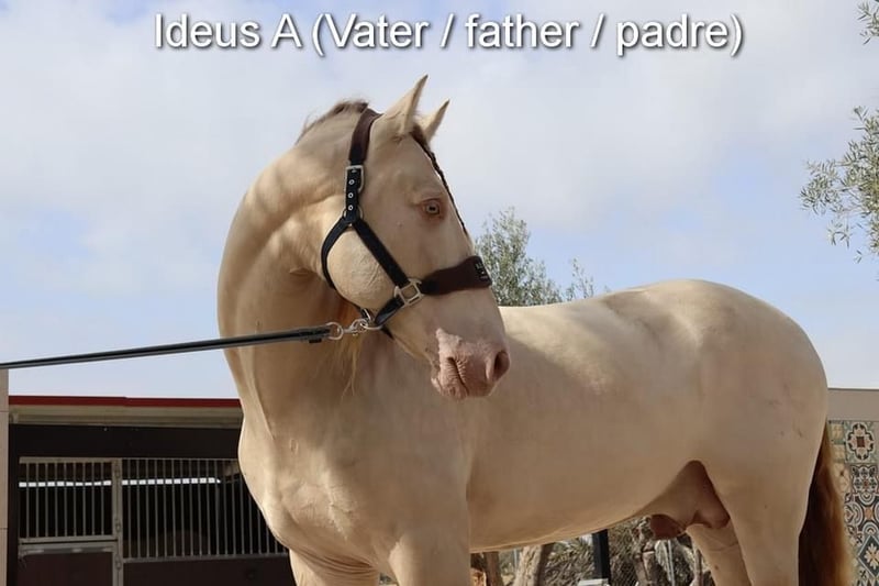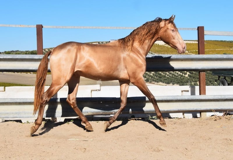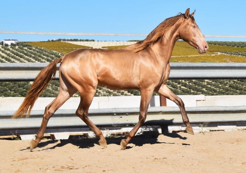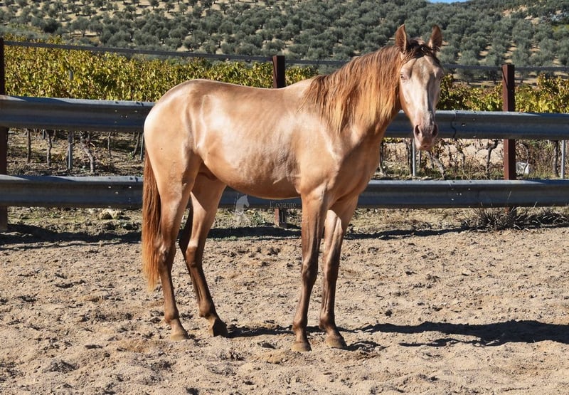 Spokojny charakter, ciekawski, surowy, stoi na zewnątrz z innymi młodymi ogierami, dobry ruch i rodowód, wyjątkowe umaszczenie, PRE Bayo Perla z papierami, rodowód: Antares, Paco Marti, Señorio de Bariain, Cardenas, Opa Karateka i Uropa Gaucho są kwalifikowane. www.elegante-andalusier.com