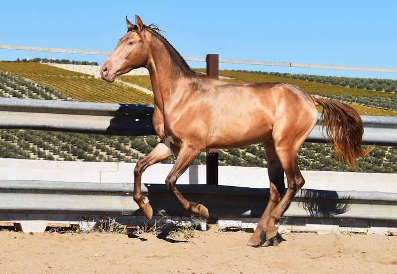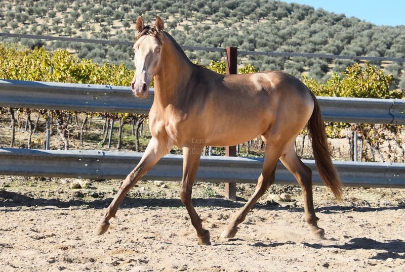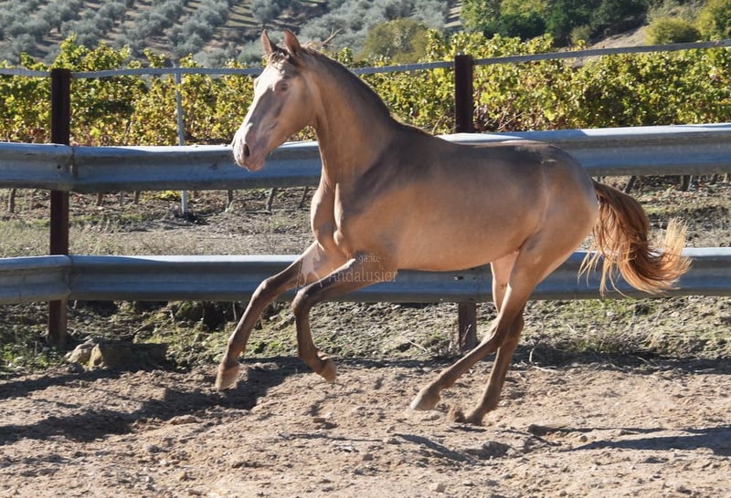 cher caractère calme, curieux, brut, est dehors avec d'autres jeunes étalons, bonnes allures et origines, robe spéciale, PRE Bayo Perla avec papiers, origines : Antares, Paco Marti, Señorio de Bariain, Cardenas, Opa Karateka et Uropa Gaucho sont qualifiés www.elegante-andalusier.com