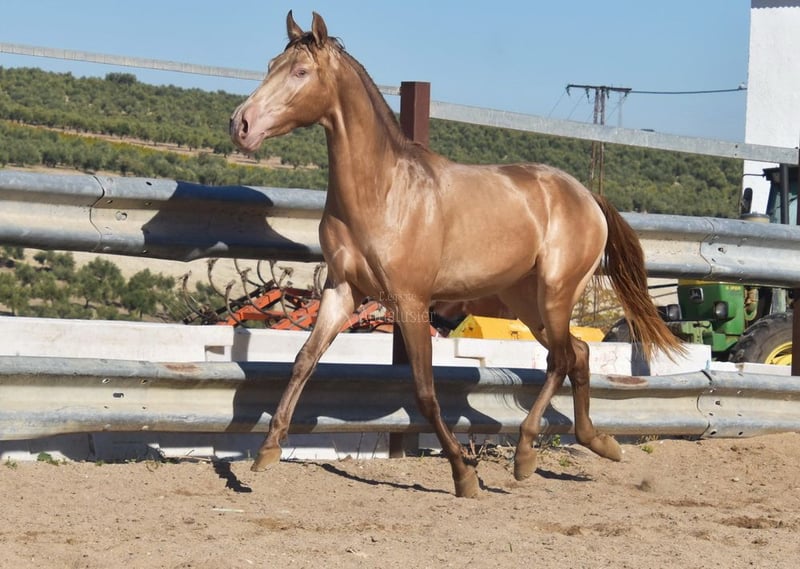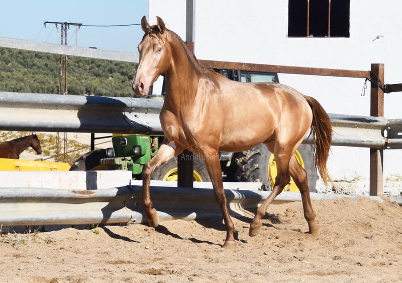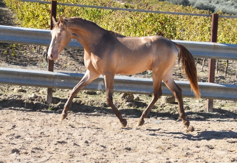 carácter tranquilo, curioso, sin domar, está afuera con otros potros jóvenes, grande, buen linaje, color especial, PRE Bayo Perla con papeles, linaje: Antares, Paco Marti, Señorio de Bariain, Cardenas, abuelo Karateka y bisabuelo Gaucho están calificados www.elegante-andalusier.com
