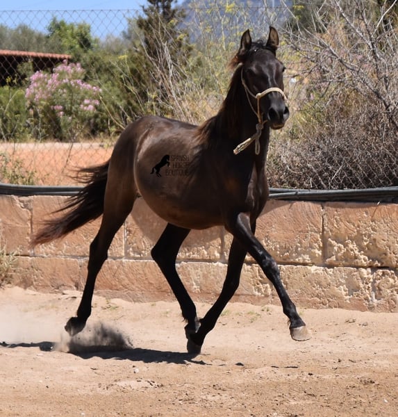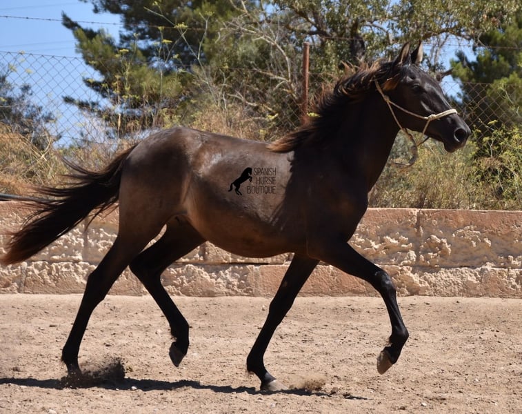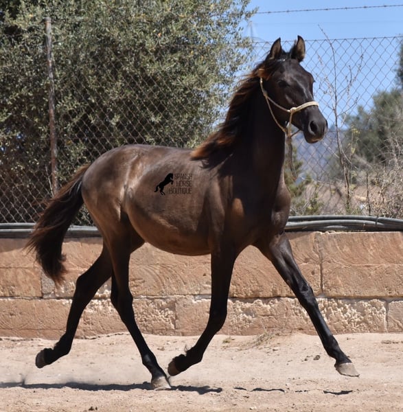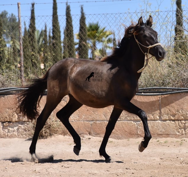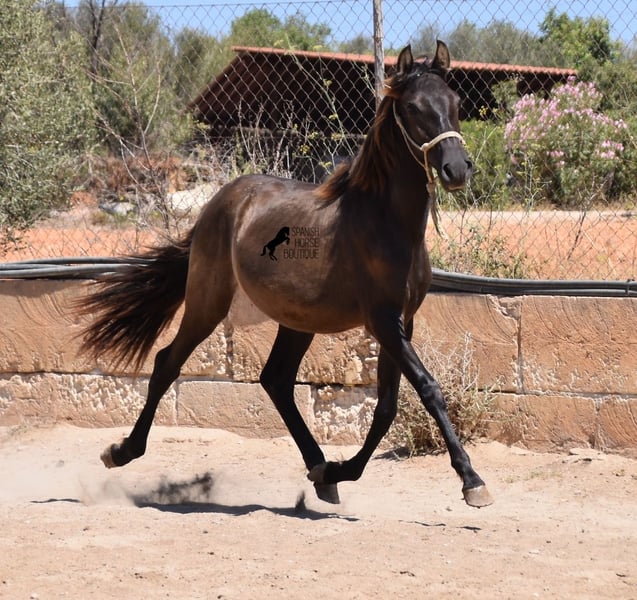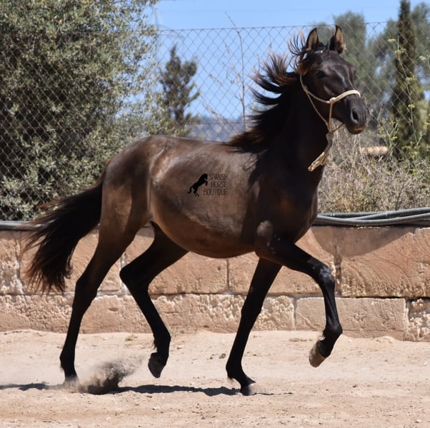 This PRE stallion (Andalusian with ANCCE breed certificate), born 04/2023, is still a little surprise in terms of color! He is registered by the ANCCE as a black stallion, but also shows signs of a dark dun. Since the color test was not done and he is the son of a Perlino, he will either be smoky black or a dark buckskin. In any case: beautiful! And for all those who don't want to be surprised, the color analysis can of course be ordered ;) The young man will not only surprise you with his color, but also with his movement! His long legs sweep across the arena and he really enjoys trotting. He is absolutely fearless and cool - which was a challenge to send him for good photos, but a great representation of his character. At some point you become a big, strong man, so you have to have the courageous character to match. He stands outside 24 hours a day in the company of other boys and is therefore well socialized and hardened. His pedigree, apart from the many special colors such as Perlino, dun and black, is also impressive. He can be traced back to the popular Mejorante stallion Remache XIII and Escalerablut can also be found in his genes. His expected final height is around 160cm. A very cool youngster with great qualities at a very fair price. His location is Mallorca. There is the possibility of leaving him with the breeder for longer. Videos and pedigree available on request. I would be happy to organize an AKU, transport or even your trip if you come to see him in person. Details can be found on my website or in conversation. Saludos from Spain