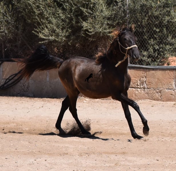 Dieser 04/2023 geborene PRE Hengst (Andalusier mit Rassenachweis der ANCCE), ist farbtechnisch noch ein kleines Überraschungsei! Er ist von der ANCCE als Rappe eingetragen, zeigt aber auch Anzeichen für einen Dunkelfalben. Da der Farbtest nicht gemacht wurde und er der Sohn von einem Perlino ist, wird er entweder Smoky Black oder ein dunkler Buckskin. In jedem Fall: Wunderschön! Und für alle, die sich nicht überraschen lassen wollen, kann natürlich die Farbanalyse in Auftrag gegeben werden ;) Überraschen wird der junge Mann nicht nur mit seiner Farbe, sondern auch seiner Bewegung! Die langen Beinchen fegen nur so über den Platz und er genießt es richtig zu traben. Dabei ist er absolut unerschrocken und cool- was eine Herausforderung war ihn für gute Fotos zu schicken, aber eine tolle Darstellung seines Charakters. Irgendwann wird man ja ein großer, starker Mann, da muss man ja auch den passend mutigen Charakter dazu haben. Er steht in Robusthaltung 24h draußen in Gesellschaft anderer Jungs und ist somit bestens sozialisiert und abgehärtet. Seine Abstammung, kann sich abgesehen von den vielen Sonderfarben wie Perlino, Falbe und Rappe, auch sehen lassen. Er ist zurückzuführen auf den beliebten Mejorante Hengst Remache XIII und auch Escalerablut findet sich immer wieder in seinen Genen. Sein zu erwartendes Endmaß ist um die 160cm. Ein sehr cooler Youngster, mit tollen Qualitäten zum sehr fairen Preis. Sein Standort ist Mallorca. Es besteht die Möglichkeit, ihn noch länger zur Aufzucht beim Züchter zu lassen. Videos und Abstammung gerne auf Anfrage. Gerne organisiere ich vor Ort eine AKU, Transport oder auch ihre Reise, sollten Sie persönlich zum Anschauen kommen. Details dazu gerne auf meiner Seite oder im Gespräch. Saludos aus Spanien