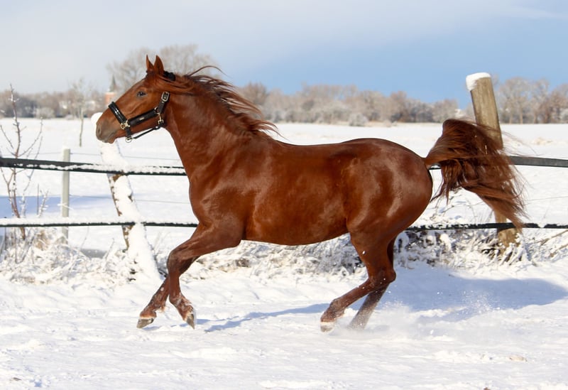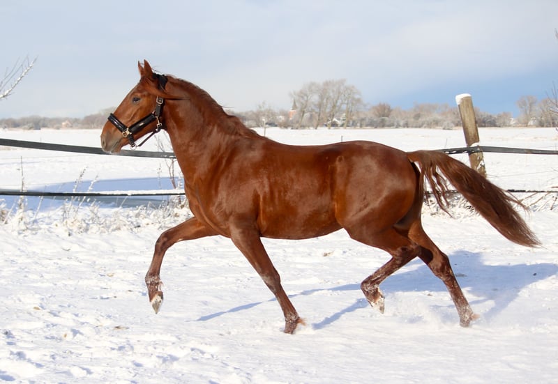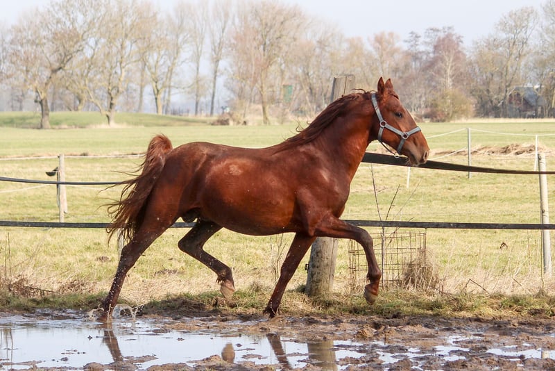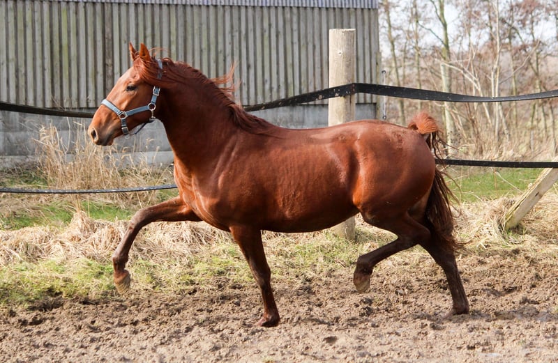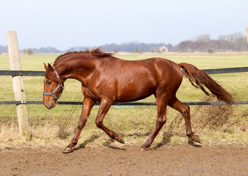 Feuerrot! Das ist er einfach F E U E R R O T. Wahnsinn, diese Farbe. Und er ist eine Erscheinung. Er ist schick, er ist iberisch, er strahlt. Gran Ducal hat wirklich alles. So schön, so talentiert. Er kann sich bewegen, hat drei gute Grundgangarten und kommt in diesem besonderen Lack daher. Er gehört zu den Iberern, die immer ein feines und seidenes Fell haben, mit viel Eigenglanz. Von den Bewegungen ist besonders der Trab hervorzuheben. Er schwingt und hat Knieaktion. Er hat dabei ein gutes Hinterbein mit viel Tragkraft. Der Rücken ist kräftig. Gran Ducal ist freundlich im Umgang. Er ist in Deutschland geboren. Er kennt Weidegang und Marschweiden. Der Vater von Gran Ducal, Acapulco Ducal, steht heute in der Schweiz und ist dort im Turniereinsatz. Sein Großvater ist bis S erfolgreich auf Turnieren gestartet und wurde wegen seiner Erfolge für die Oldenburger Zucht anerkannt.