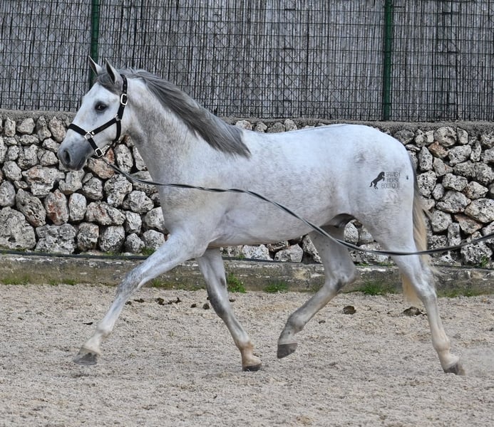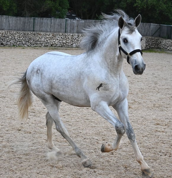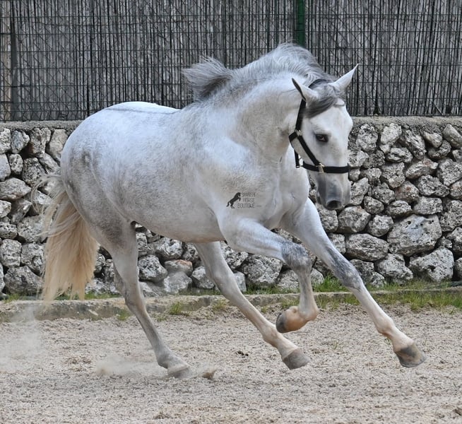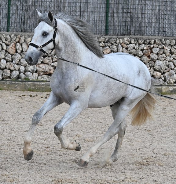 This 2023-born, purebred PRE (Andalusian with pedigree certification from ANCCE) could not have a nobler lineage! His father is the multiple world champion FER BONACHON de Eda, so on the paternal side, he could hardly be more exquisitely bred... But the lineage of the mother is also exquisite, as she was already successful at breeding shows at a young age and was even crowned champion mare of the competition! She is not only a descendant of ARMAS FELINO but also has Campo Bajo blood. The value of selective breeding is truly evident in this high-quality youngster. Champions on both sides of the pedigree, providing him not only with breed-typical characteristics but also with good movement. He has already demonstrated this at the breeding show. Thus, he is already accustomed to being loaded, being in new places, and lunging with a halter. As it is preferred at the breeding show, he is temporarily shod in front but will be transitioned back to barefoot. He also regularly goes into the lunging machine to build muscle and not just grow in height, as he already measures 160cm and is expected to grow towards 170cm!! For the preparation for the breeding show, he was moved from the stallion herd and now lives in a paddock box next to other stallions and is accustomed to having mares nearby – they smell quite interesting for the teenager ;) Price according to quality. His current height is 160cm. He is currently in Menorca! Videos and pedigree available upon request. I would be happy to organize an AKU (pre-purchase examination), castration, training, transport, or even your trip if you wish to come see him in person. Details are available on my page or in conversation. Greetings from Spain.