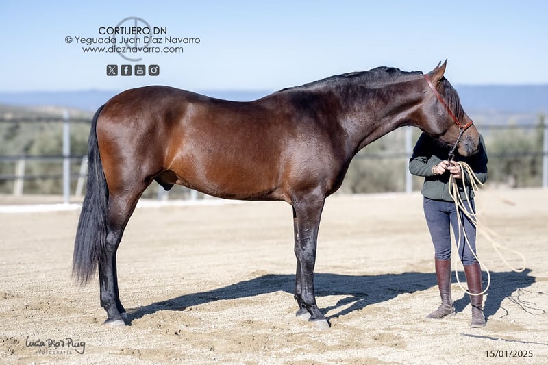 Intelligent colt with very good character. Working under saddle with cinchuelo and fixed rein. Shortly, small rides. Three good gaits. Lines: Velero XI, Rumex, Corzo IV, Obcecado, Levitón, Llamativo II, Ulster. Ventura Camacho, Granda, Yeguada Militar, Vizconde de la Montesina, Urquijo, D. Benito Zoido, Bohorquez.