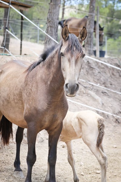 Mantecado is a colt born in August 2023 and registered with ANCCE. His dam is CAPEA XI (a buckskin mare) and his sire is an ISABELO (PrlPrl) stallion. He has inherited the cream gene from his dam and the PRL gene from his sire. He is tested and his genetic code is EEAACrPrl. He is a foal raised in family, very affectionate and close to people. He already knows the farrier, knows how to be tied, trailer training and lives in a herd where he can grow. He enjoys a diet based on high mountain hay and PAVO brand foal feed.