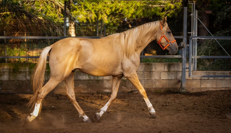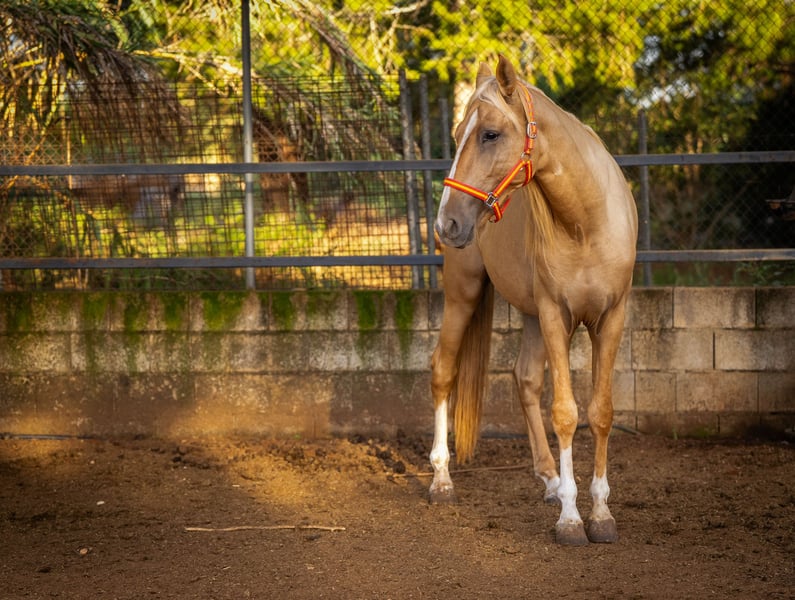 Breed: PRE Type: Warmblood Gender: Stallion Age: 3 years Height: 156 cm Color: Palomino Main Discipline: Dressage Other Disciplines: Working Equitation, Baroque, Leisure Breeding Association: Asociación Nacional de Criadores de Caballos de Pura Raza Española (ANCCE) Additional Features: - Raw - Allrounder - Barefoot - Free from eczema - free from Pyroplasmosis Quimba – a 2-year-old PRE colt captivates with his striking blaze and four white legs. His outgoing and affectionate nature makes him a true treasure. He loves to cuddle and always approaches you joyfully. Especially in the morning during feeding, he greets you with an early whinny. Playful and curious, Quimba is familiar with handling electric fences. In the herd, he is rather low-ranking, yet he remains friendly and does not let others bother him. His father is the beautiful cremello stallion Kefir JL (seen in the last picture), which underscores his impressive lineage. Quimba is a wonderful companion for anyone looking for a loving and playful horse. More information available upon request!