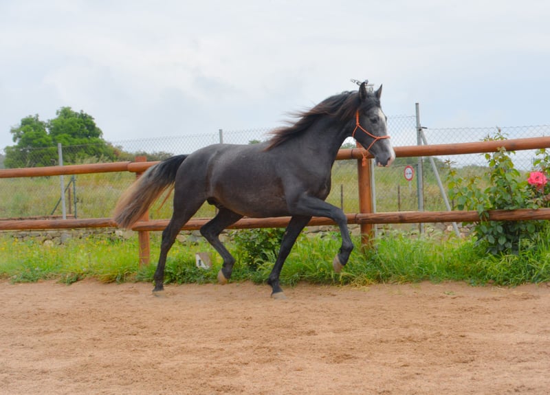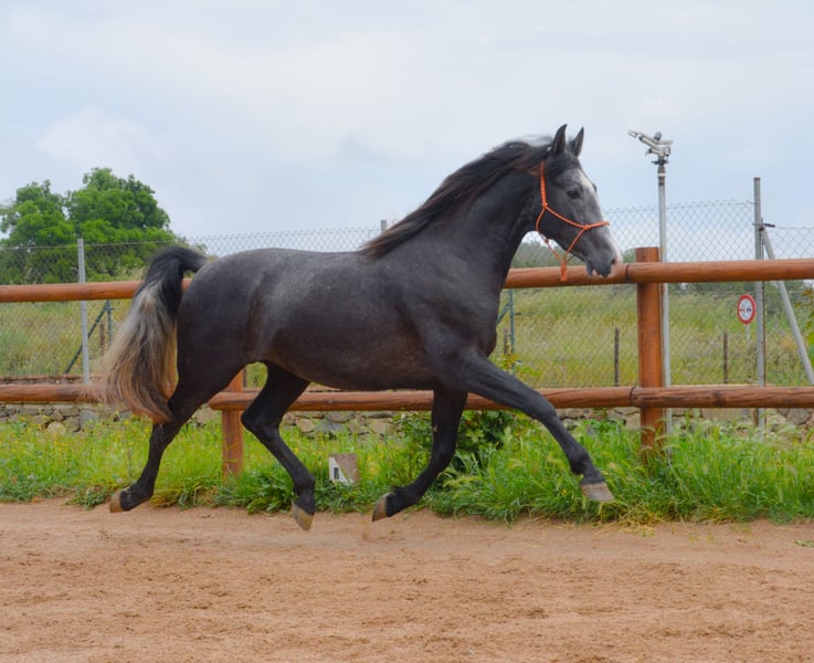 CORRIOL II, 3-jähriger PRE-Hengst, Schimmel, 162 cm hoch, frisch vom Feld, mit guten Bewegungen und Morphologie, beginnt mit der Ausbildung und wird gerade angeritten.
