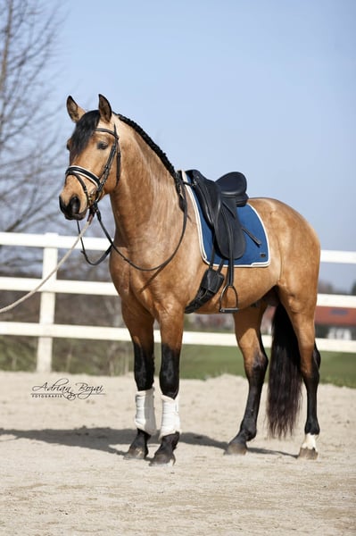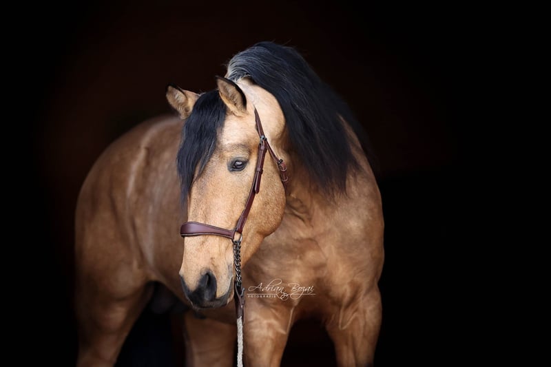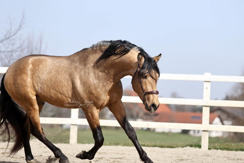 **Verkaufsanzeige: Vielversprechender Falbe aus dem Jahrgang 2022** SIMBAD SH, ein Hengst wie aus dem Bilderbuch, der ausdrucksstarke Pura Raza Española besticht durch seine ansprechende Erscheinung und sein harmonisches Exterieur. Mit einem geschätzten Endstockmaß von von 163-165 cm verfügt er über eine praktische Größe, die ihn sowohl im sportlichen Einsatz als auch in der Freizeitreiterei vielseitig einsetzbar macht. Der junge Hengst wurde bereits schonend von Frauenhand eingeritten und zeigt viel Talent für eine vielseitige Ausbildung. Seine Bewegungen sind für ein spanisches Pferd extrem gut, im Schritt tritt er 3-4 Huf breit über, sein Galopp ist von hoher Qualität und der Trab taktklar und reell, einfach gut ! Somit bietet er ideale Voraussetzungen für den sportlich ambitionierten Reiter. Durch seine neugierige Art und sein freundliches und auch selbstsicheres Wesen ist er sowohl für erfahrene Reiter als auch für ambitionierte Freizeitreiter geeignet. Zu erwähnen ist seine gute Hufstellung und die Tatsache dass er sehr gut Barhuf läuft. Der Hengst hat eine Verkaufsuntersuchung incl. Röntgenbilder ohne einem bedenklichem Befund. Aufgewachsen ist er in Galizien, artgerecht in der Herde auf großen Flächen mit Waldstücken und Weide. Pferde aus Galizien haben so gut wie keine Umstellungsprobleme, da die Vegetation gut vergleichbar mit der unseren ist. Sie kennen fette Wiesen, viel Regen und auch Schnee. Sein bisheriges Leben war unbeschwert und schön. Eine negative Erfahrung musste er noch nie machen. Dadurch gibt er dem Menschen sein vollstes Vertrauen. Allgemeine Information zum kennenlernen unserer Pferde: Wir geben uns größte Mühe die Pferde vertrauensvoll an das Reitpferde-Leben heranzuführen. Wir präsentieren die Pferde sehr gerne an der Longe und unter dem Reiter. Bei ernsthaftem Kaufinteresse darf selbstverständlich auch probegeritten und vom Boden aus gearbeitet werden. Für die Besichtigungszeit fällt eine Schutzgebühr von 50.- Euro pro Besuch an. Hiermit schützen wir unsere Verkaufspferde vor dem in Mode gekommenen Probiertourismus. Wir haben die Erfahrung gemacht, dass unsere Pferdekäufer dankbar darüber sind, dass Ihr zukünftiges Pferd nicht von zu vielen Händen probiert wurde. Wir danken für Ihr Verständnis. Sie können Ihre Pferdesuche auch gerne mit ein paar Tage Urlaub verbinden. Unsere gemütlichen Ferienwohnungen direkt im Gestüt erlauben Ihnen ein 24-Stunden kennenlernen der Pferde. Bei Interesse oder für weitere Informationen stehe ich gerne zur Verfügung. Kontaktieren Sie mich, um mehr über diesen liebenswerten Kerl zu erfahren.