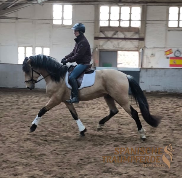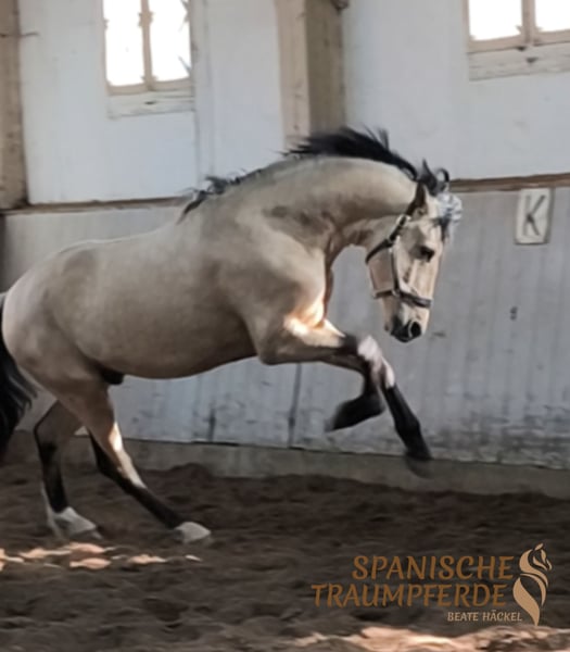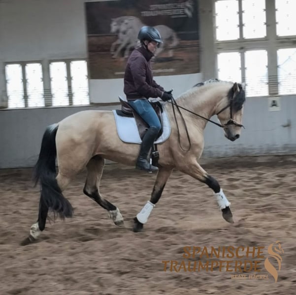 PRE-Hengst in traumhafter Falbfarbe – charmanter Blickfang mit tollen Bewegungen Dieser wunderschöne PRE-Hengst in traumhafter Falbfarbe mit herrlich dunklem Behang ist bei uns in Traventhal eingezogen und sucht nun seinen ganz besonderen Menschen sowie ein liebevolles Für-immer-Zuhause. 🐎✨ SULEIMAN überzeugt nicht nur durch seine edle Erscheinung, sondern auch durch seinen charmanten und aufgeweckten Charakter. Mit einer komfortablen Größe von 164 cm bringt er ideale Voraussetzungen für viele Reiter mit. Sein ausdrucksstarkes Köpfchen mit den großen, runden Kulleraugen erobert im Nu jedes Herz. ❤️ Auch bewegungstechnisch weiß dieser PRE-Hengst zu begeistern: Er verfügt über raumgreifende, taktsichere Grundgangarten und zeigt sich motiviert und angenehm unter dem Sattel. Damit bringt er beste Voraussetzungen für ein wundervolles Reitpferd mit – egal ob für Freizeit, Dressurarbeit oder weitere Ausbildung. Im täglichen Umgang präsentiert sich SULEIMAN menschenbezogen, aufmerksam und freundlich. Er ist ein echter Hingucker mit Ausstrahlung und Charme. SULEIMAN sucht einen Menschen, der seine Qualität und seinen besonderen Charakter zu schätzen weiß und ihn weiter fördert. Röntgenbilder sind vorhanden Standort: 23795 Traventhal Ein Kennenlernen unseres SULEIMAN SH ist nach Absprache nahezu jederzeit möglich. Für diesen Kennenlerntermin aus Bodenarbeit, Spazierengehen, gegebenenfalls Probereiten, nehme ich mir ausreichend Zeit, damit du dein Traumpferd in allen Facetten ganz in Ruhe kennenlernen kann. Dafür berechne ich zum Schutz unserer Pferde und um Reittourismus vorzubeugen eine Pauschale von 50 €.