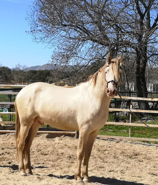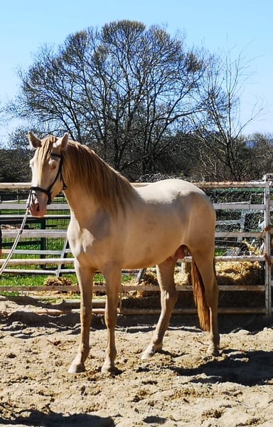 Fast 3-jähriger PRE-Hengst von ALBERO LXXVI (letzte 3 Fotos). Eingetragen im ANCCE-Stutbuch, wird in Kürze lizenziert. Sehr barock und hübsch, mit einzigartigem perlaschefarbenem Fell und schöner Mähne und Schweif. Aktuell 165 cm am Widerrist und wächst noch. Großes Potenzial für die Zucht von verdünnt farbigen PRE-Pferden oder Shows. Guter, freundlicher Charakter. Freilandhaltung. Genetische Fellfarbe bereits getestet - auf Anfrage erhältlich.