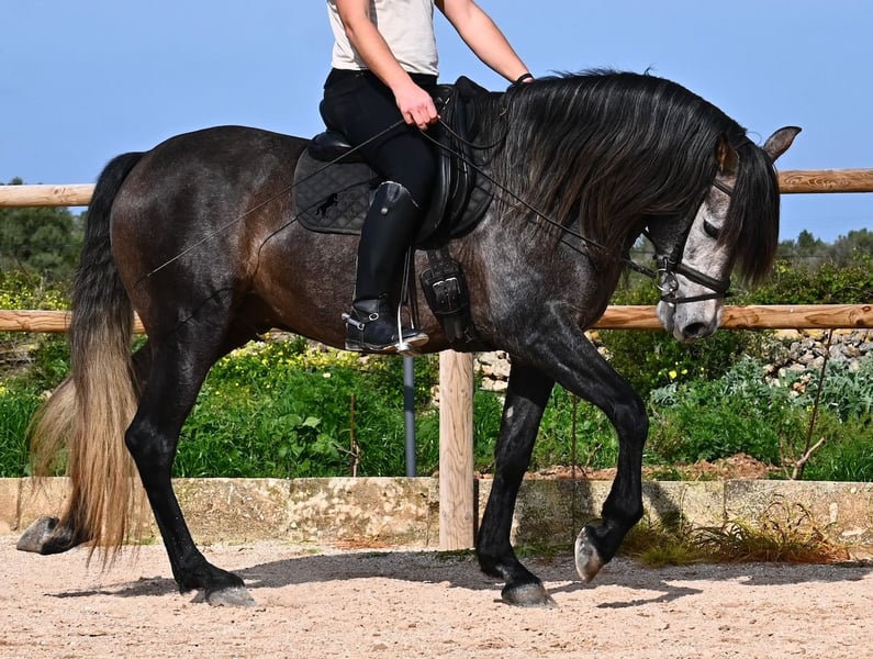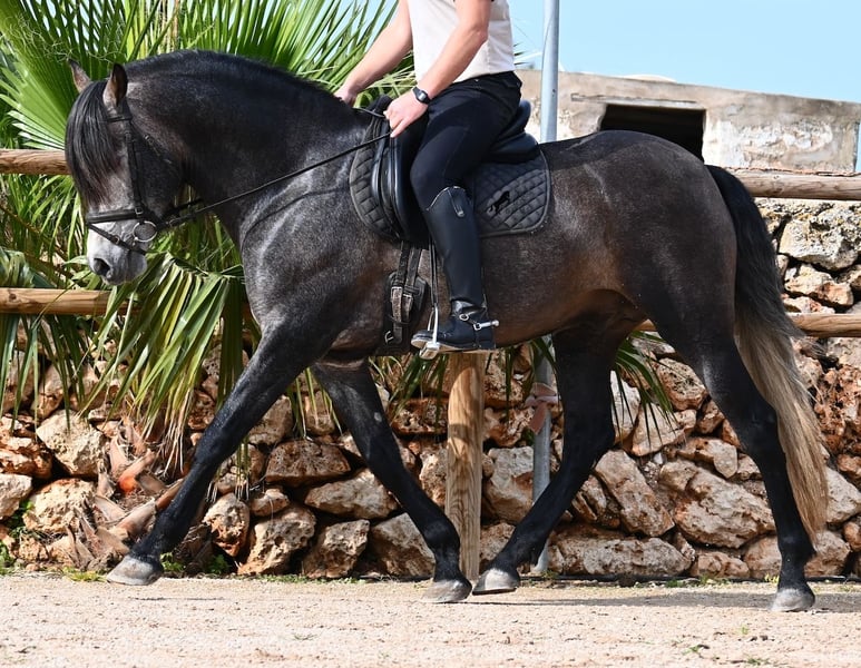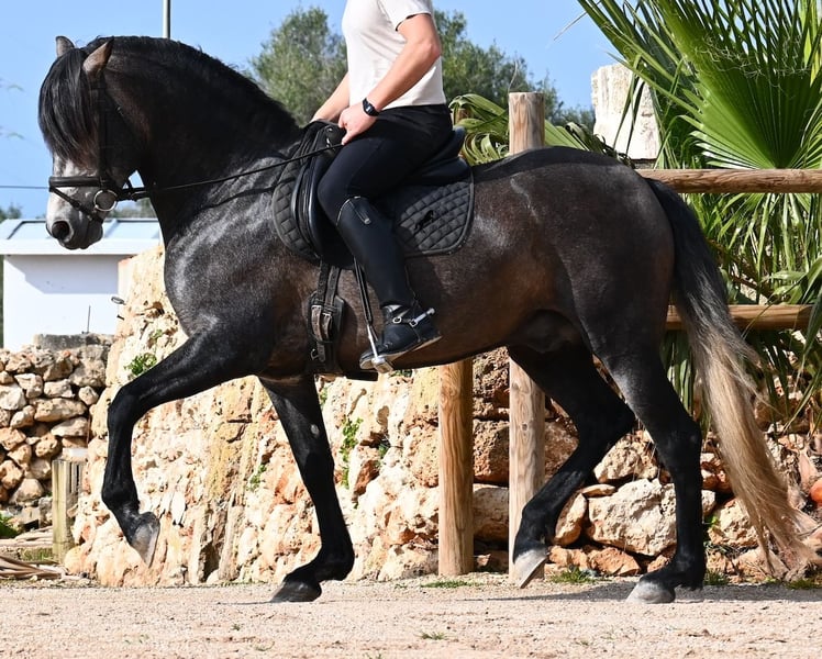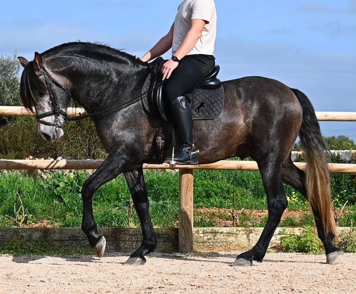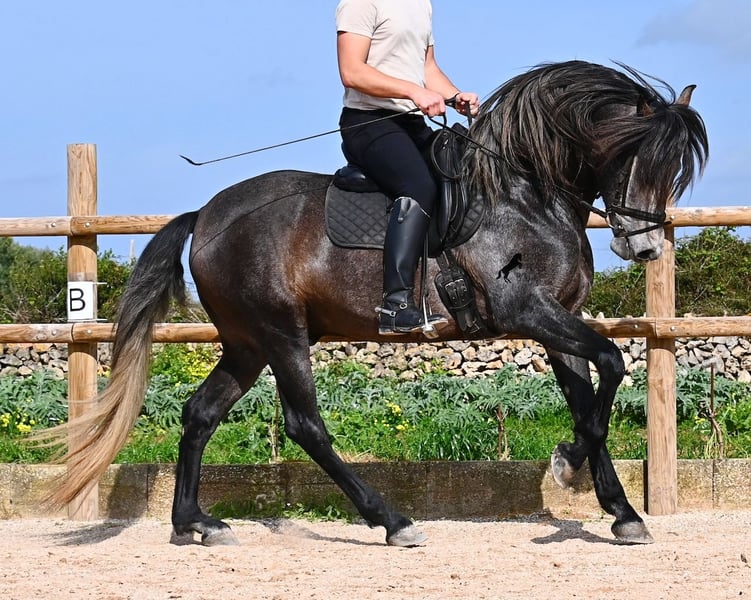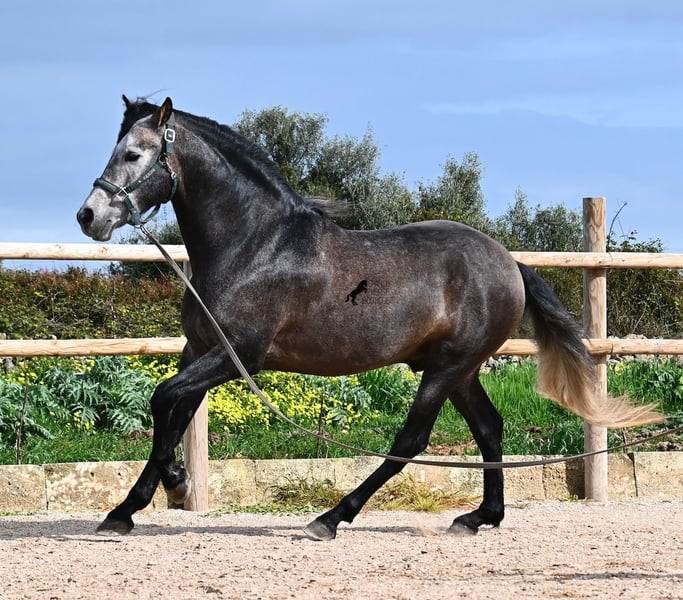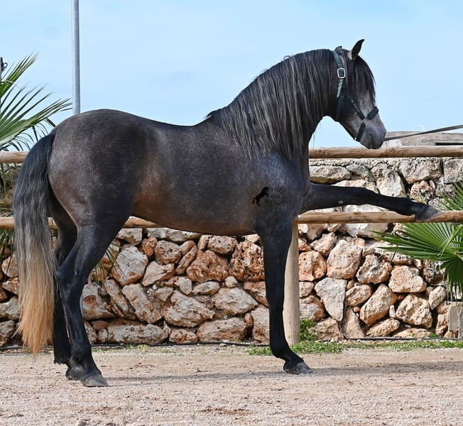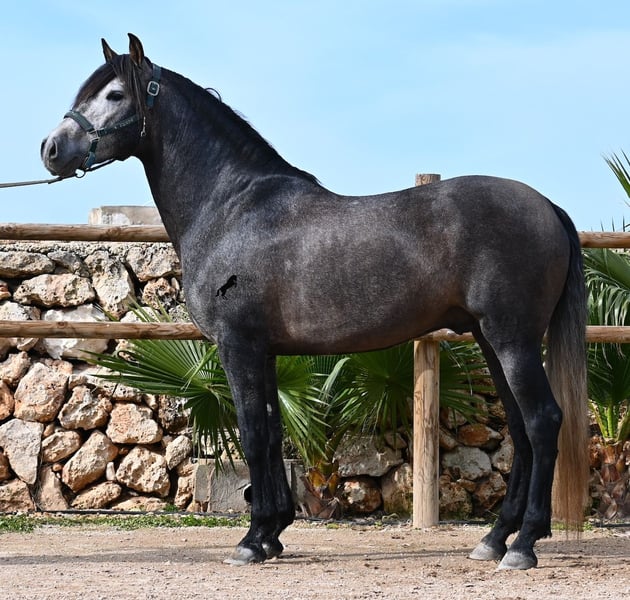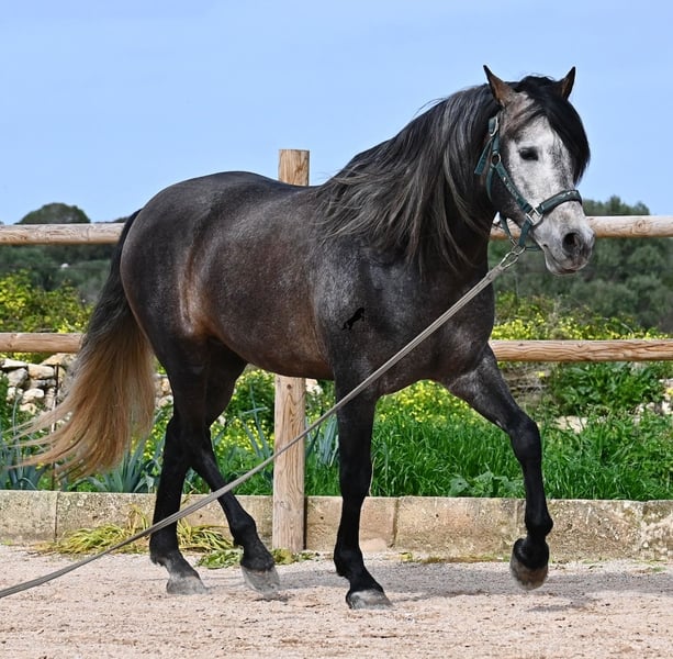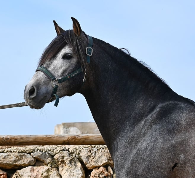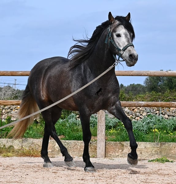 Né en 2021, ce cheval PRE pure race (Andalou avec pedigree reconnu par l'ANCCE) provient d’un éleveur très soucieux du bien-être de ses chevaux. Jusqu’à l’âge de 3,5 ans, il a grandi en liberté au sein d’un troupeau de jeunes mâles, simplement en étant un cheval parmi d’autres, développant ainsi d’excellentes compétences sociales. Il vit actuellement dans un grand paddock-box, entouré de ses compagnons avec qui il a grandi. Cette éducation et cette gestion lui ont permis de rester parfaitement détendu, très respectueux envers l’humain, et même lorsqu’un petit poney lui tire la queue lors du pansage, il ne bouge pas d’un poil. C’est un jeune cheval très calme et posé, ce qui est pris en compte dans sa formation. Il n’est ni pressé ni nerveux, mais on lui donne le temps nécessaire. Son niveau d’éducation peut être comparé à celui d’un cheval de 4 ans, ce qui est un avantage, car il est travaillé en douceur (actuellement 3 fois par semaine). Il bénéficie régulièrement de phases de repos en main longue, et il apprend à s’étirer de mieux en mieux, ce qui est très agréable à voir. Malgré un sol parfois rocailleux, il se déplace en extérieur sans problème en barefoot, et il apprécie aussi de troquer la carrière contre une belle balade. Dès son poulain, il était très baroque, avec un extérieur typique du "vieil élevage". Sa lignée en témoigne, puisqu’il descend de MONIS, SA SINIA, CAMPO BAJO et YEGUADA MILITAR (Cartujano). Avec une taille actuelle d’environ 157 cm, sa morphologie est harmonieuse et compacte, tout en étant agile, ce qui le rend intéressant pour la Working Equitation ou le Western riding. Sous la selle, il est très attentif et très appliqué, toujours concentré sur l’humain. Il maintient déjà un bon contact, mais, étant encore jeune, il a besoin d’un peu plus d’équilibre et de puissance venant de l’arrière (il n’est pas travaillé à la hâte, mais en douceur, avec un développement progressif). Il monte en mors à olive et des exercices latéraux ont été entamés. Sa base de dressage est solide. En main, c’est un gentleman, que ce soit pour les soins aux pieds ou le saddle. (Vidéos disponibles.) Il apprend le pas espagnol et a montré lors de l’arrêt qu’il maîtrise très bien cette démarche, avec une belle liberté d’épaule. Pour ceux qui ne peuvent pas accueillir un étalon, une castration sur place est bien entendu possible. Sa taille finale prévue est d’environ 160 cm, mais son allure baroque lui donne une impression de plus grande taille, et il couvre très bien. Il se trouve à Minorque. Vidéos et pedigree disponibles sur demande. Je peux également organiser une AKU, un débourrage, une castration, un transport ou votre voyage, si vous souhaitez venir le voir en personne. N’hésitez pas à me contacter pour plus de détails, soit via mon site, soit lors d’un échange. Cordialement depuis l’Espagne