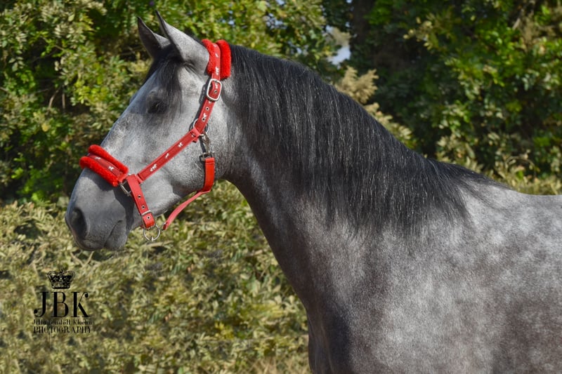 Un gran PRE con excelentes líneas de sangre. Comanche mide actualmente 1,6o m. Nació el 23.05.2021. Su línea de sangre está repleta de ejemplares de distinción. Incluye algunos tesoros criados por Teodoro Herce, ejemplares de Yeguada Lovera y el elitista Educado X del programa de cría de Guardiola. Con Candau y Pallares tenemos líneas Cartujano probadas. Un príncipe de ensueño, este gran joven semental. Su PRE superior se refleja no sólo en sus movimientos, sino también en su carácter. También coopera muy bien, se interesa por todo lo nuevo y no tiene ningún problema en el entrenamiento y el manejo.