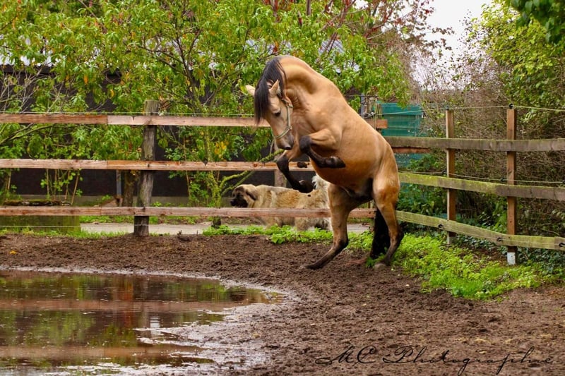 **Te koop: PRE Hengst** Te koop is een prachtige PRE hengst, geboren in 2021. Met zijn opvallende palomino vacht en een schofthoogte van 160 cm is hij een echte blikvanger. Deze getalenteerde hengst toont groot potentieel in de dressuursport en is klaar om met een ervaren ruiter door te starten. Zijn bewegingen zijn elegant en soepel, wat hem een veelbelovende partner maakt voor toekomstige uitdagingen. Hij is goed opgevoed, braaf in de omgang en heeft een vriendelijk karakter, wat hem tot een ideale metgezel maakt, zowel voor de sport als voor de vrije tijd. Leeftijdsgebonden gelongeerd. Naaktvoeter. Kent zowel stal als paddock. Bij serieuze interesse of verdere vragen ben ik graag beschikbaar. Bezoek ons en overtuig uzelf van deze geweldige hengst!