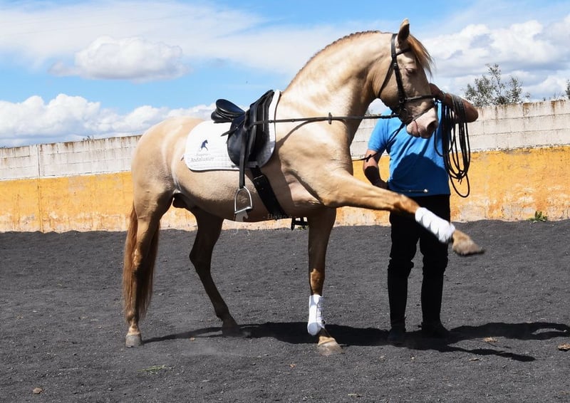 lovely character, ridden in basic gaits, Spanish walk, baroque, very comfortable, sofa horse, special color, PRE Bayo Perla (CrPrl) with papers, good movements and pedigree, lineage: Salvador Miras Gomez, Paco Marti, Yeguada la Llana, great-grandfather Gaucho III is qualified www.elegante-andalusier.com