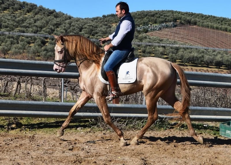 Caractère doux, calme, curieux, joueur et affectueux. Monté en allures de base, adapté à la randonnée. Grand, de style baroque, confortable. Cheval de reproduction, étalon, couleur spéciale. Baya Perla (CrPrl) avec papiers PRE. Radiographies bonnes, Piro négatif. Origines : Antonio Guiral Guarga, Castillo Villafranca, Paco Martí. www.elegante-andalusier.com