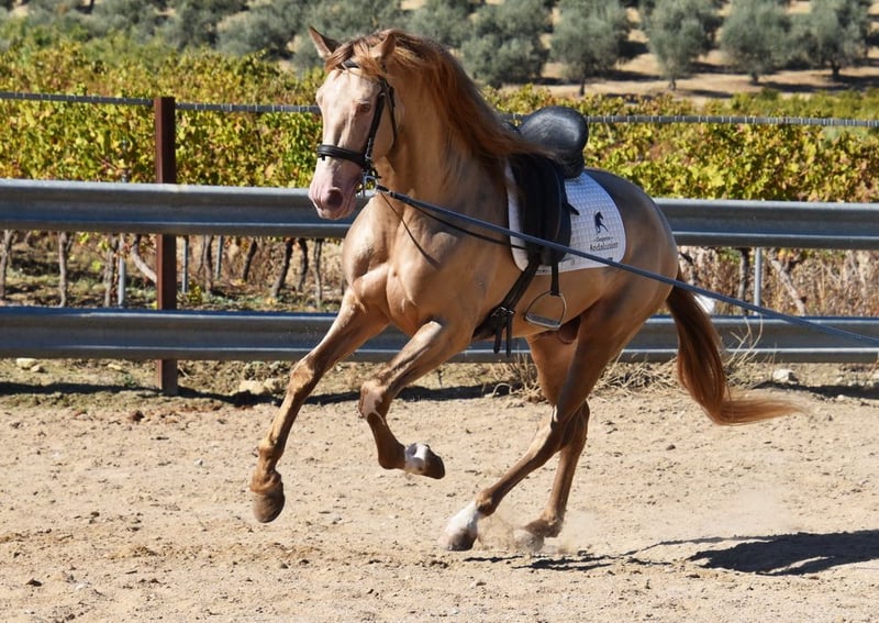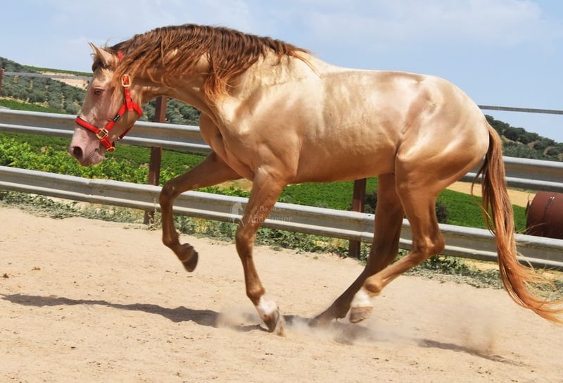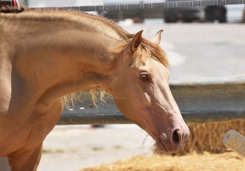 Caractère doux, calme, curieux, joueur et affectueux. Monté en allures de base, adapté à la randonnée. Grand, de style baroque, confortable. Cheval de reproduction, étalon, couleur spéciale. Baya Perla (CrPrl) avec papiers PRE. Radiographies bonnes, Piro négatif. Origines : Antonio Guiral Guarga, Castillo Villafranca, Paco Martí. www.elegante-andalusier.com