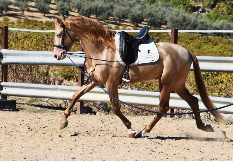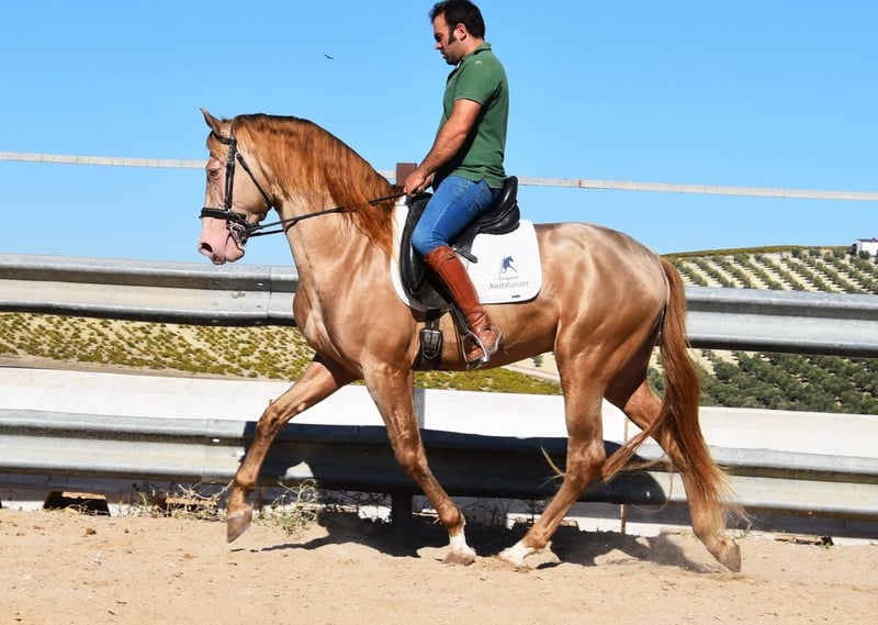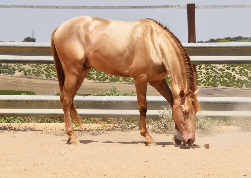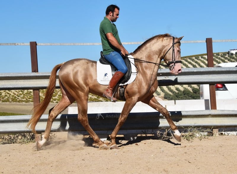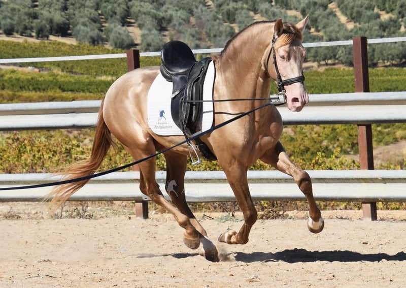 Carattere dolce, tranquillo, curioso, giocoso e affettuoso. Montato in passo, trotto e galoppo su terreno. Di statura grande, di stampo barocco, comodo, stallone da monta, con colore speciale, Baya Perla (CrPrl) con pedigree PRE. Radiografie di buona qualità e Piro negativo. Pedigree: Antonio Guiral Guarga, Castillo Villafranca, Paco Marti. www.elegante-andalusier.com