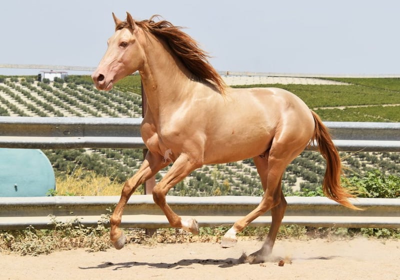 Gentle, calm temperament; curious, playful, affectionate. Trained in basic gaits, suitable for trail riding. Large, baroque, comfortable ride. Licensed breeding stallion with a special color. Baya Perla (CrPrl) with PRE papers. Good X-ray results and Piro negative. Pedigree: Antonio Guiral Guarga, Castillo Villafranca, Paco Marti. www.elegante-andalusier.com