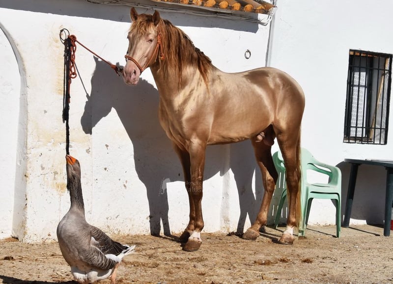 lieber ruhiger Charakter, neugierig, verspielt, verschmust, in den Grundgangarten geritten, Gelände, groß, barock, bequem, gekört, Deckhengst, spezielle Farbe, Baya Perla (CrPrl) mit PRE Papieren, gute Röntgen und Piro negativ, Abstammung: Antonio Guiral Guarga, Castillo Villafranca, Paco Marti www.elegante-andalusier.com