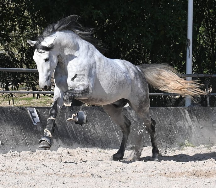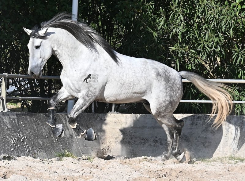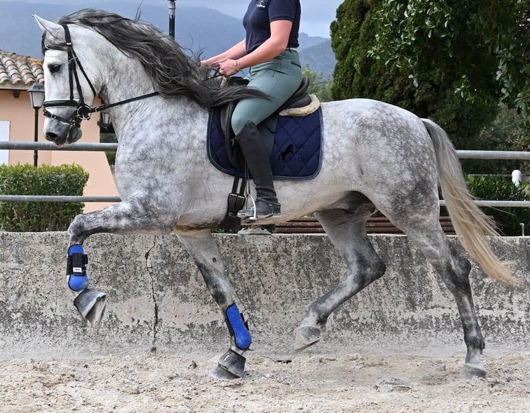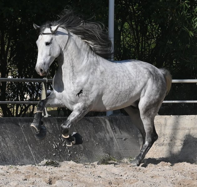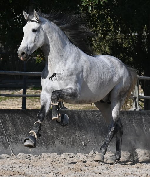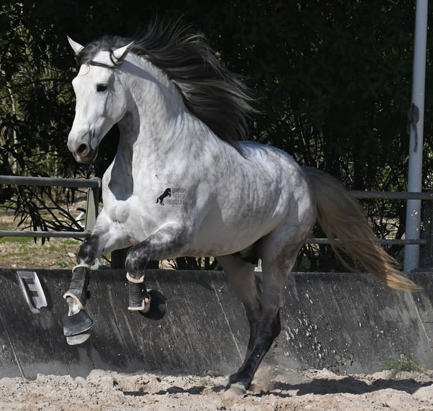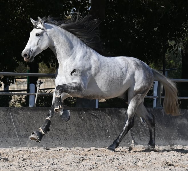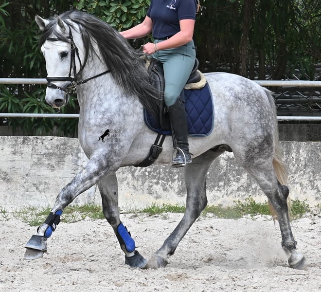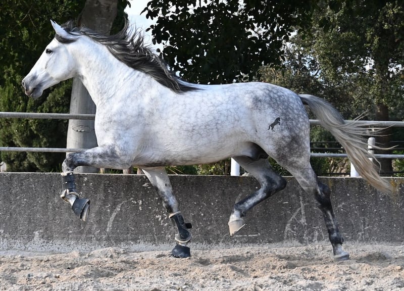 Dieser 2021 geborene PRE Hengst (Andalusier mit Rassenachweis der ANCCE) ist ein Bilderbuch-Spanier! Schön barock, wallende Mähne, spanischer Esprit, waches aber sanftes Auge und ein graziler Kopf. Dazu bewegt er sich noch unfassbar gut, er fliegt wirklich nur so über den Platz, wie ich es selten bei einem Spanier gesehen habe. Das kommt nicht von ungefähr, denn er ist ein Sohn des weltbekannten Dressurmeisters ROMERO DE TRUJILLO! Der Papa räumt alle Schleifchen und Preise ab, die es in der Dressurwelt des PRE zu ergattern gibt und dieser sein Sohn, hat auch großes Potenzial, um dressurambitionierte Reiter glücklich zu machen. Dazu kommt noch JUDIO VII als Großvater, der bis heute einer der wichtigsten Hengste der Rasse war und vermutlich für immer unvergessen bleibt. Daher kommt dieses klassische-spanische Exterieur und das Leuchten in den Augen, denn die Judios sind weltklasse Pferde, auch in der Morfologie und sehr sehr beliebt in der Welt des PRE. Der junge Mann misst schon stattliche 167cm (wächst noch!) und da es dem Züchter wichtig ist, dass seine Pferde langsam heranwachsen und nicht überfordert werden, war er lange in der Hengstherde auf vielen Hektar Land und ist aktuell basis angeritten. Er ist sehr arbeitssam, man braucht nur etwas Feingefühl sein Feuer zu zügeln,und noch tut er sich etwas schwer, immer zu 100% aufmerksam zu sein, was aber absolut normal ist, für ein Jungpferd mit Energie. Ohne Zweifel ist dieser Hengst eine hervorragende Option für ambitionierte Reiter die das spanische Pferd und die Dressur lieben, sowie für Züchter! Er ist bereits gekört, hat aber noch nicht gedeckt. Sollte Hengsthaltung nicht möglich sein, besteht die Möglichkeit der Kastration vor Ort. Preis der Qualität entsprechend! Aktuell steht er auf Mallorca! Videos und Abstammung gerne auf Anfrage. Ein Top Pferd zu einem sehr fairen Preis. Gerne organisiere ich vor Ort eine AKU, Beritt, Transport oder auch ihre Reise, sollten Sie persönlich zum Anschauen kommen. Details dazu gerne auf meiner Seite oder im Gespräch. Saludos aus Spanien