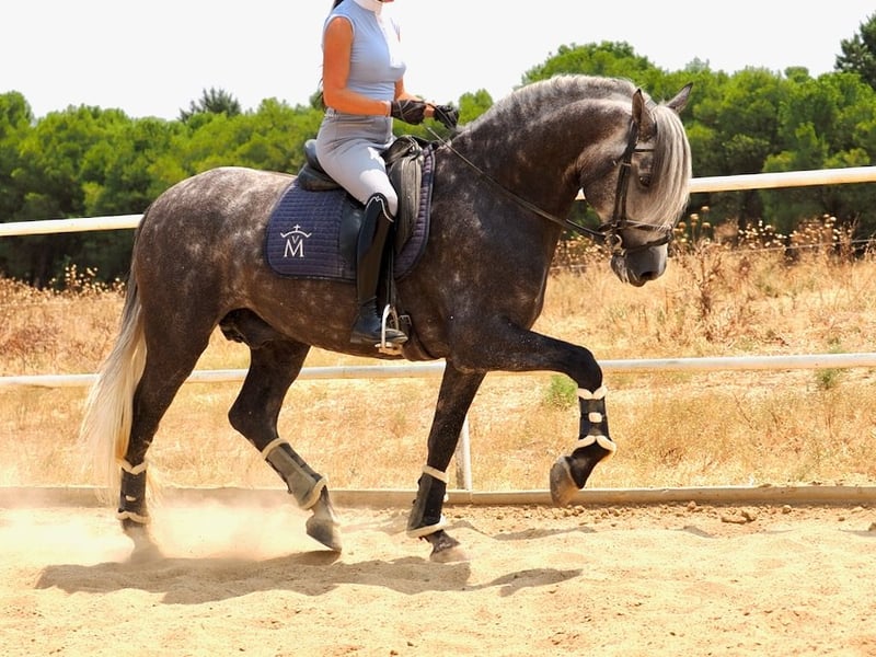 We present this impressive Pura Raza Española stallion, born in 2020, with a spectacular height of 167 cm. He is a young horse with a solid training foundation and a very promising projection for classical dressage. Currently, he is ridden at a basic level, showing very good contact, always responsive to the aids, and with great willingness to learn and progress. One of his most remarkable features is his natural ease in all three gaits: walk, trot, and canter. In the walk, he moves with fluidity and regularity; in the trot, he combines elasticity and elevation; and in the canter, he shows balance and good cadence. These qualities, together with his harmonious build and correct conformation, make him a very versatile horse, with potential both for competition and for enjoying quality daily work. His noble and well-balanced temperament makes him especially pleasant to handle, both in the arena and in everyday routines. He inspires confidence in the rider and always responds willingly, without showing difficult behaviours. In short, this young PRE stallion is a safe choice for those seeking a horse with excellent foundations, a good temperament, and great potential for classical dressage. An opportunity to enjoy the beauty, nobility, and functionality that characterise the Spanish breed.