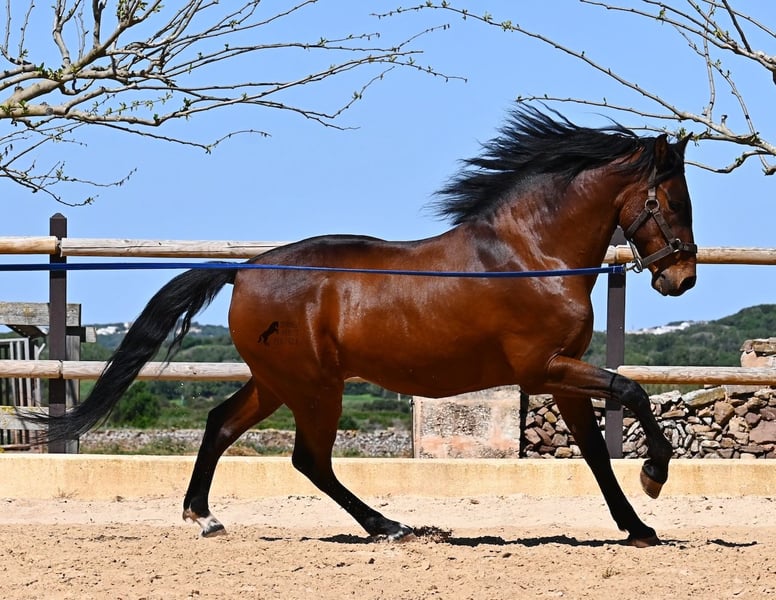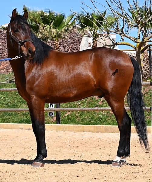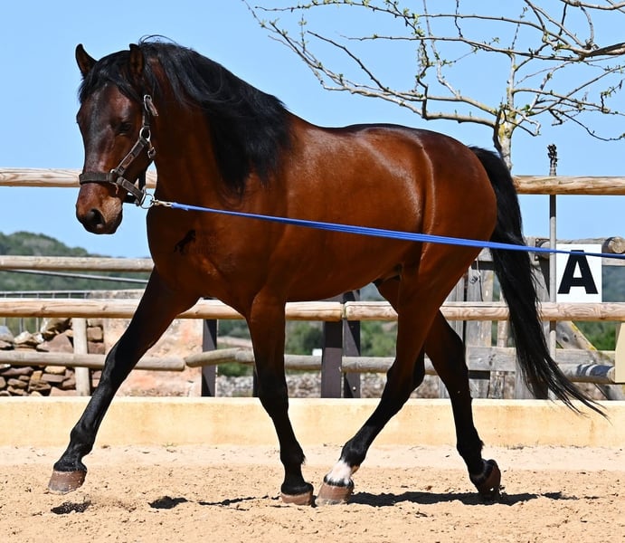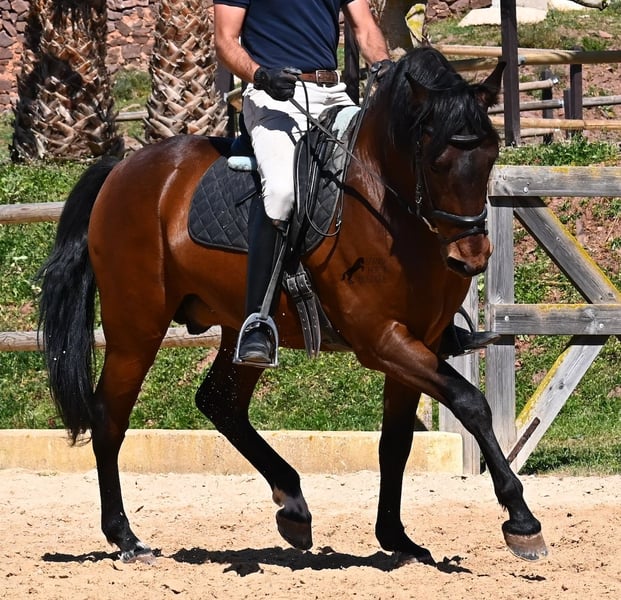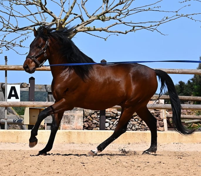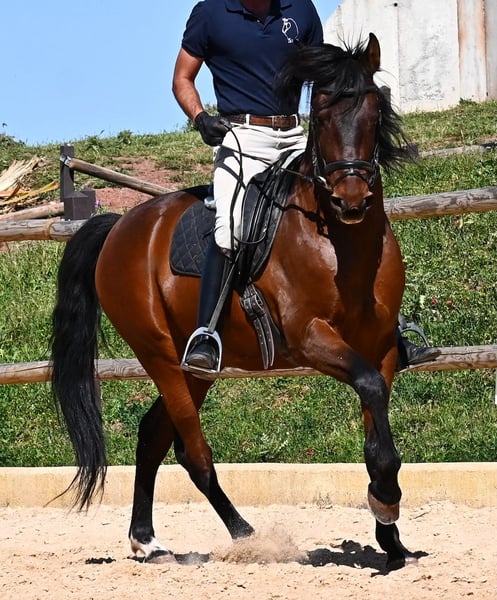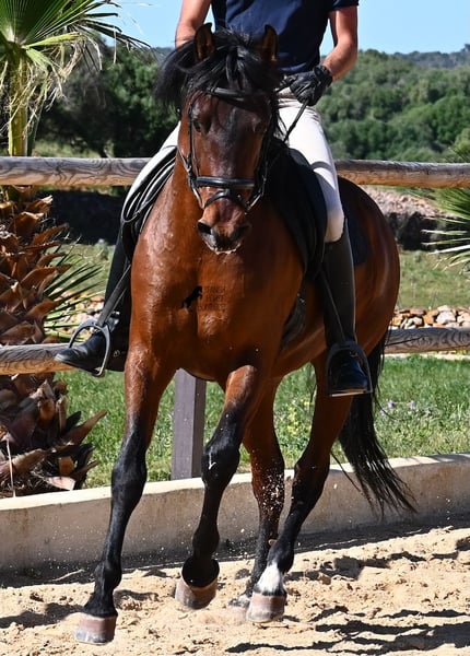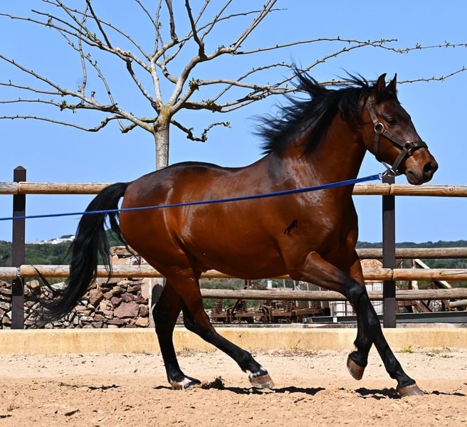 Dieser 2020 geborene, reinrassige PRE Hengst (Andalusier mit Rassenachweis der ANCCE), ist ein richtiges Powerpaket der nur so vor Elan bei der Arbeit strotzt! Er kommt von einem liebevollen Züchter, wo Spätentwickler wie die Spanier, das bekommen, was sie wirklich brauchen- Zeit! So ist er bis 3 in der Hengstherde komplett roh gestanden, wurde dann kurzzeitig aufgestallt, um die Basics zu lernen und dann wieder in den Urlaub entlassen, um alles mit Zeit zu verarbeiten. So hat er aktuell eine gute Basis unter dem Sattel, wo besonders darauf geachtet wird, dass er gut zu differenzieren lernt, zwischen seinem Vorwärtsdrang und Ruhephasen unter dem Reiter. Er lernt immer besser, sich selbst zu tragen, sich zu strecken und Ruhephasen zu verlängern, was sehr schön zu sehen ist. Ein Pferd, dass nicht in der Ausbildung gehetzt wurde, sondern sich erst finden darf und lernt die Energie zu lenken. Und Arbeitswillen hat er ohne Ende! Wo anderen schnell die Puste ausgeht, gibt er mehr und ist unermüdlich, womit er bestimmt ein Ideales Pferd für sehr ambitionierte Reiter ist, die gerne regelmäßig und gezielt trainieren. Geritten wird er auf doppelt gebrochener Wassertrense und ist nur an den Vorderhufen beschlagen. Nachts lebt er auf einem Hengstpaddock, was seinem Kopf auch sehr gut tut und tagsüber ist er in der Box für fürsorgliche Pflege und die korrekte Fütterung ist so besser garantiert. Ausritte auf dem hektargroßen Areal tun ihm auch gut und man merkt richtig, wie er da in seine Mitte findet, als positive Abwechslung zum Viereck. An leichten Arbeitstagen geht er in die Führmaschine und wird auch so weiter bemuskelt, ohne Gewicht zu tragen. In seiner Abstammung finden wir Ausnahmehengste wie YACO de TORRELUNA, ERMITAÑO III und sein Bruder ist sehr erfolgreich in der Dressur und hat es sogar zum SICAB (Weltmeisterschaft der PRE) geschafft. Er hat noch nicht gedeckt und kennt es, in der Nähe von Stuten zu sein, wobei die Option der Kastration vor Ort, selbstverständlich besteht. Aktuell misst er 157cm und hat ein schön barockes Exterieur, mit einem feinen Spanierkopf und guten Bewegungen, die ihn für viele Sparten mit hohem Arbeitsniveau interessant machen. Preiskategorie E! Sein Standort ist Menorca. Videos und Abstammung gerne auf Anfrage. Gerne organisiere ich vor Ort eine AKU, Beritt, Kastration, Transport oder auch ihre Reise, sollten Sie persönlich zum Anschauen kommen. Details dazu gerne auf meiner Seite oder im Gespräch. Saludos aus Spanien