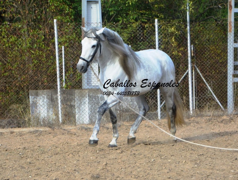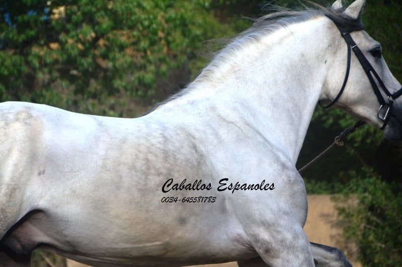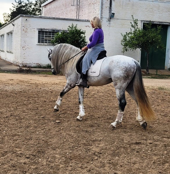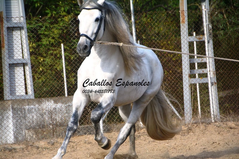 Een droomachtige, prachtige PRE-hengst, in barokke uitstraling van de oude soort. De jonge hengst is correct en harmonieus gebouwd. Hij heeft een zeer evenwichtig karakter, is superbraaf tijdens het verzorgen en staat rustig naast een andere hengst. Mijn speelse honden hebben hem nooit lastiggevallen. De grijze is uitgerust met drie goede basisgangen die zeer comfortabel zitten. Zijn galop is mooi bergop. Hij is in de basisgangen gereden, er wordt gewerkt aan schouder- en flankrijden en zachte beenhulpen. In het terrein was hij ook en toont zich daar zeer braaf. Afstamming: vader is Hacendado (Marin García), Pampero VII. Het paard wordt in opdracht verkocht. Hij kan graag bij ons nog in opleiding blijven. Een keuring wordt op korte termijn georganiseerd. Internationaal transport mogelijk.